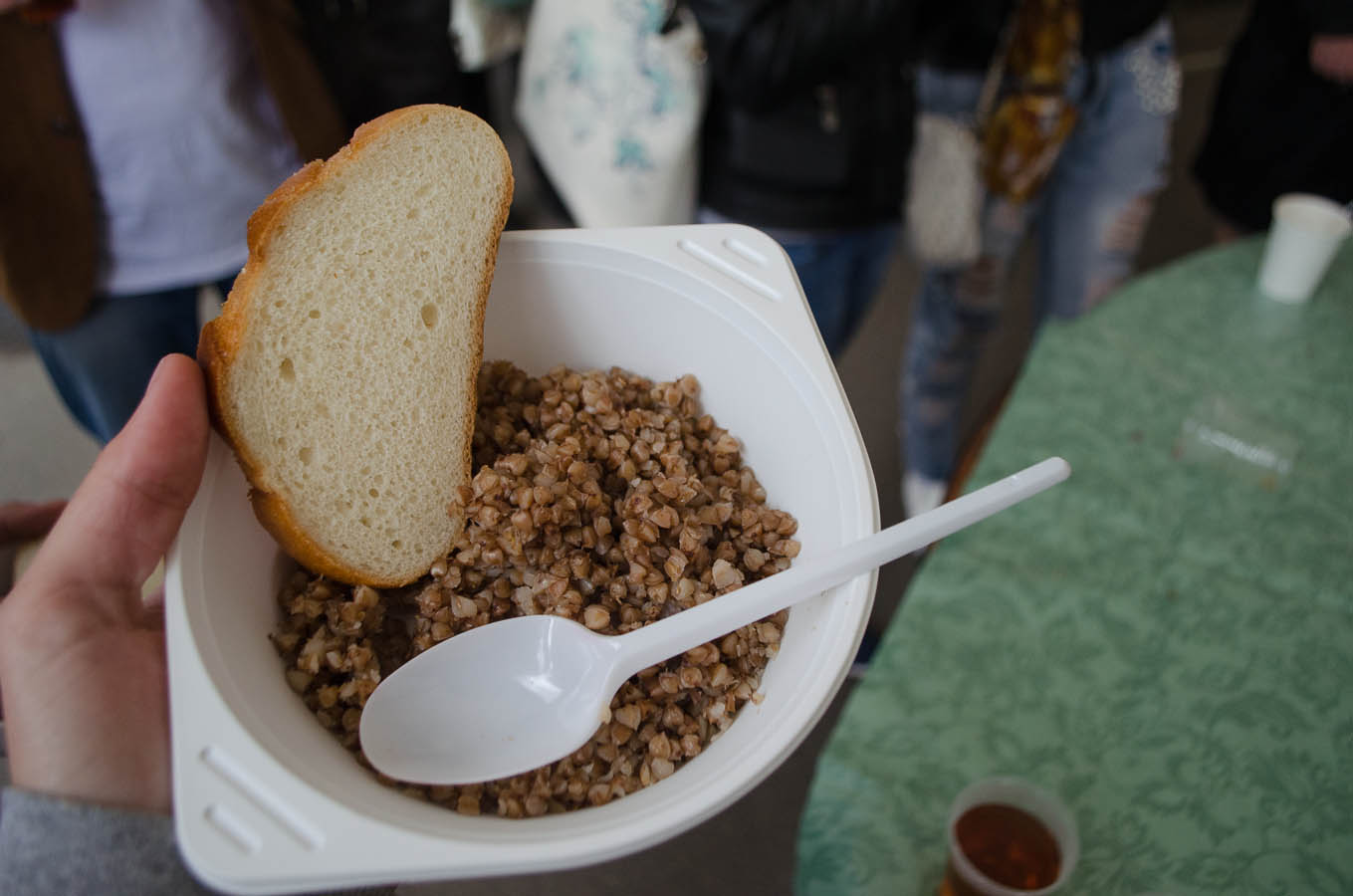 Угощали гречневой кашей, так что дитёнок не голодал.