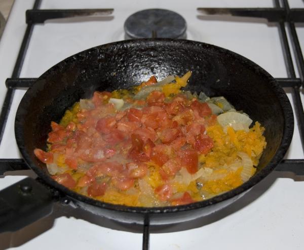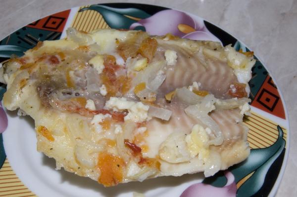 Приготовление: Слегка разморозить филе рыбы. Морковь натереть на терке, лук порезать кубиками и обжарить на сливочном масле. Добавить помидоры и потушить 5-7 минут. Приготовить яично-луковую массу. Для этого необходимо смешать молоко, яйца, лук, мука, посолить, поперчить.