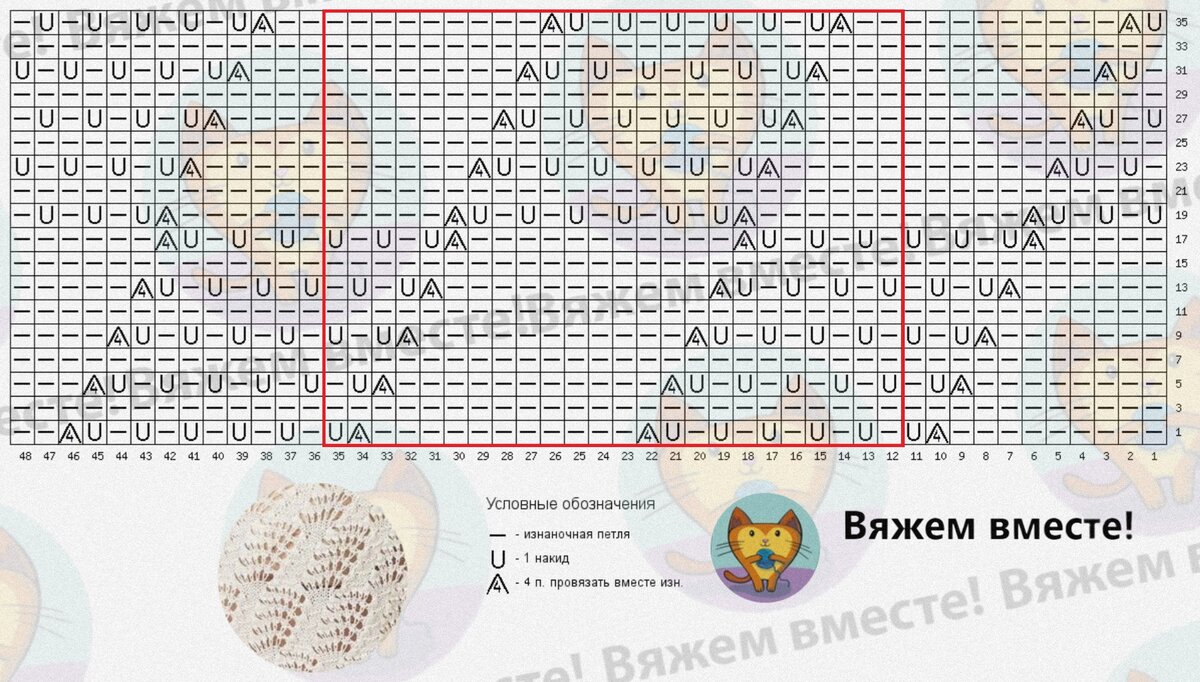 В оригинале узор вяжется на основе изнаночной глади, но думаю, что и по лицевой глади рисунок будет смотреться не менее красиво. Если всё же задумаете поменять изнаночные петли на лицевые, то и 4 петли вместе провязывайте лицевыми.