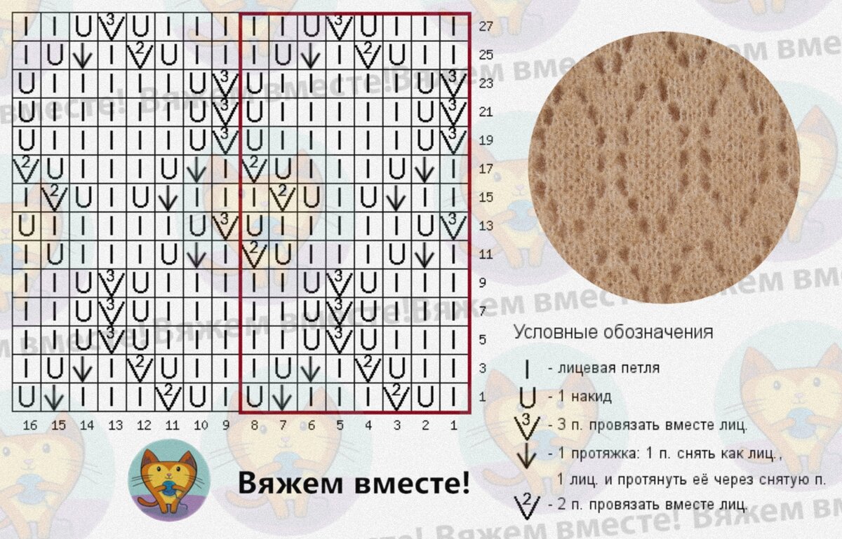 Схема узора. Раппорт составляет 8 петель и 28 рядов, обозначен красной рамкой на схеме. Чётные ряды не даны на схеме, вяжутся по рисунку петель на спице.