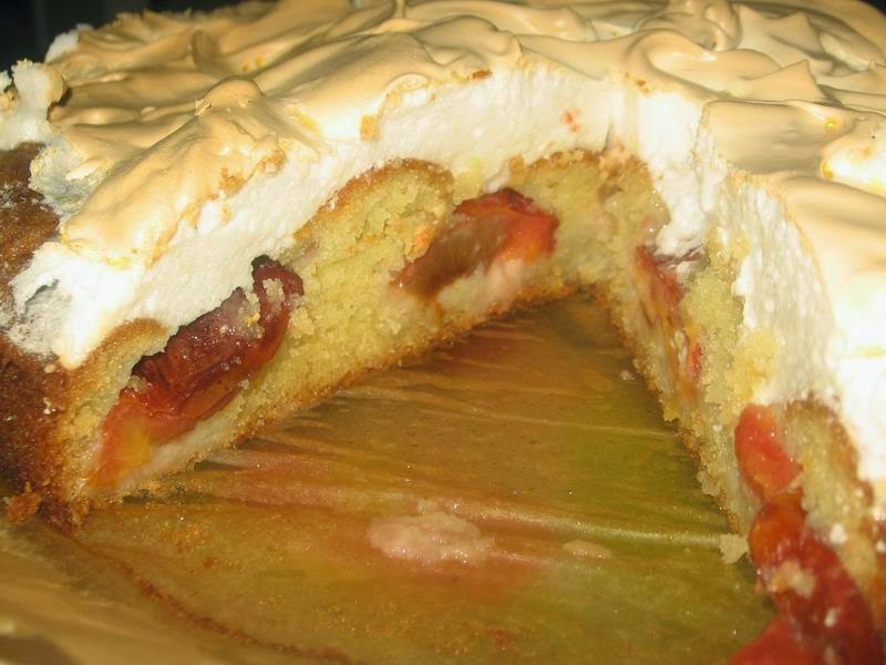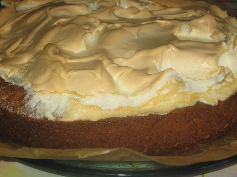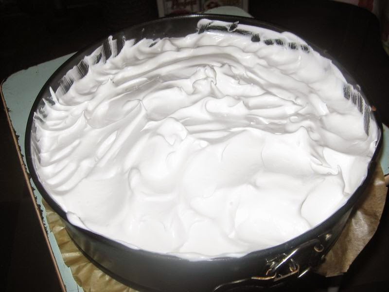 Мирог почти готов. Достаём его из духовки, проверяем лучинкой готовность, сверху выкладываем безе и опять в духовку на 15 минут, не меняя температуры.
