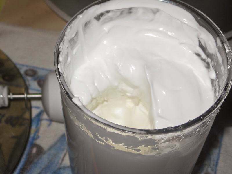 Пока пирог в духовке, можно чайку попить, а потом заняться приготовлением безе. Белки быстрее взобъются, если добавить щепотку соли при взбивании. Сначала взбиваю без сахара, потом добавляем сахар. Белки взбить до устойчивых пиков.