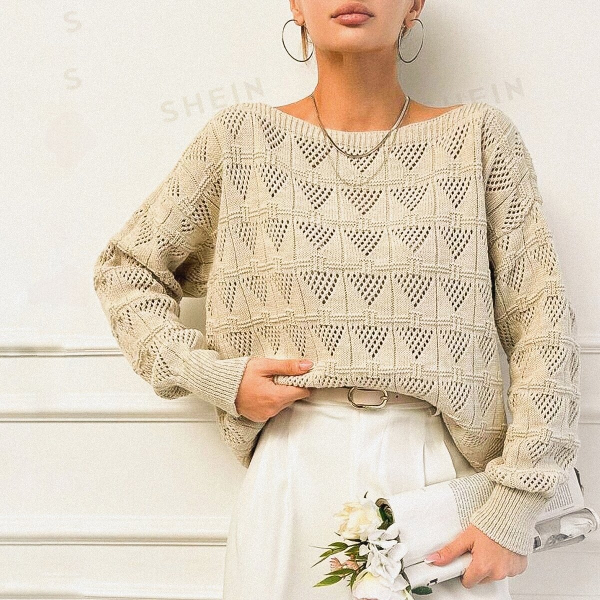 Бежевый джемпер с деликатной игрой фактуры и рельефа в полотне, которые образуют геометрические квадраты и ажурные треугольники, станет утонченным дополнением к весеннему образу.