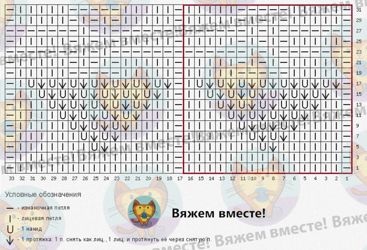 Один раппорт узора равен 16 петлям по ширине и 32 рядам по высоте, выделен красной рамкой на схеме.