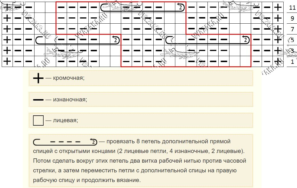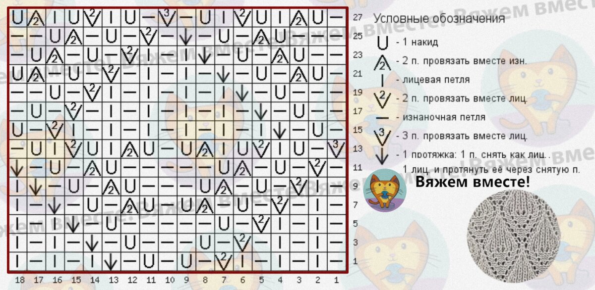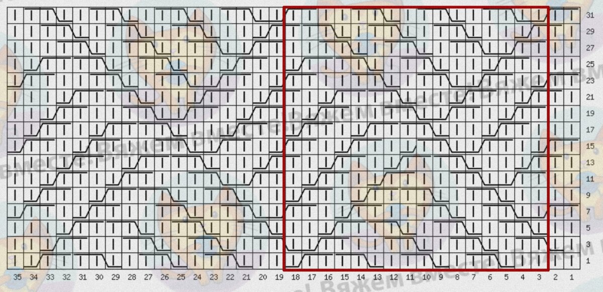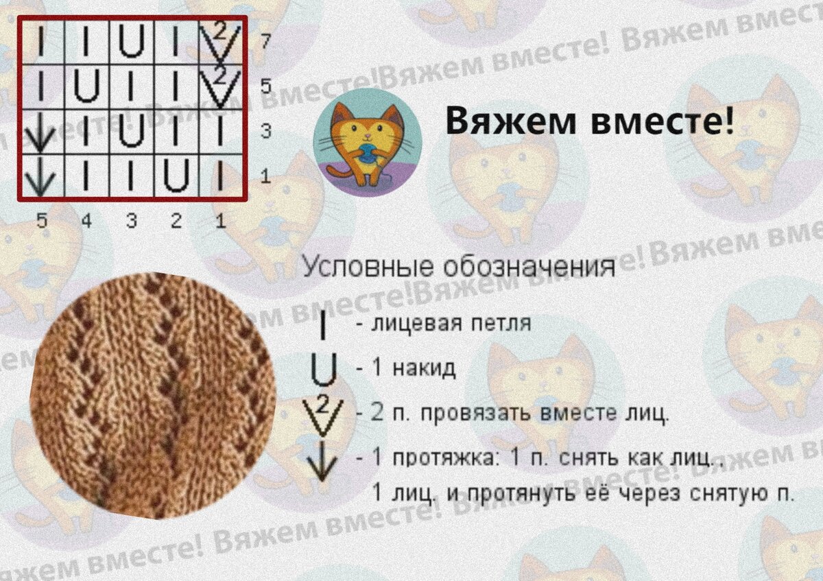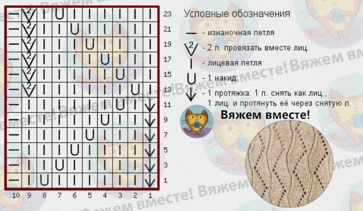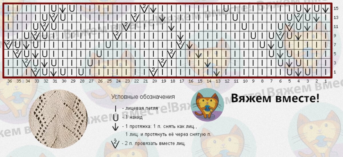 Красивая модель с ажурными зигзагами и дорожками из, как показалось мне, вытянутых петель между ними. На схеме ниже я обозначила принцип вязания только ажурных зигзагов.