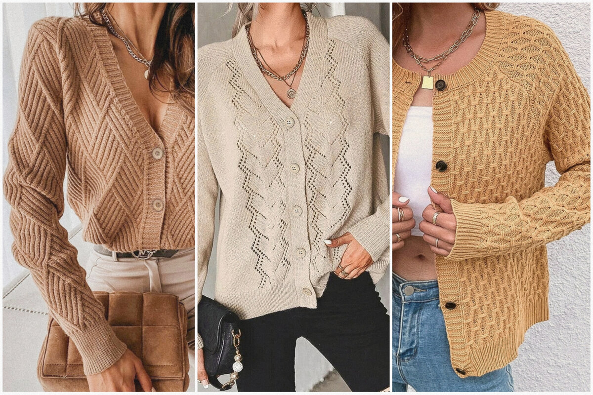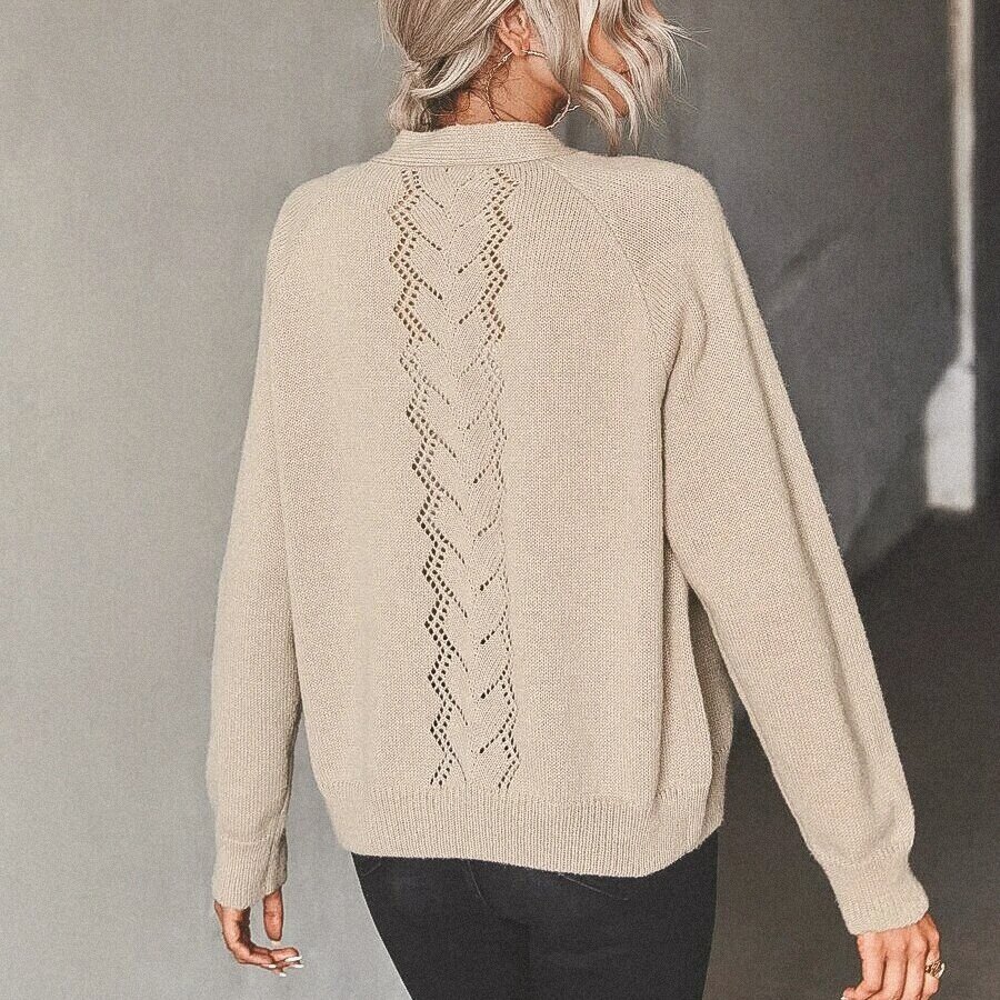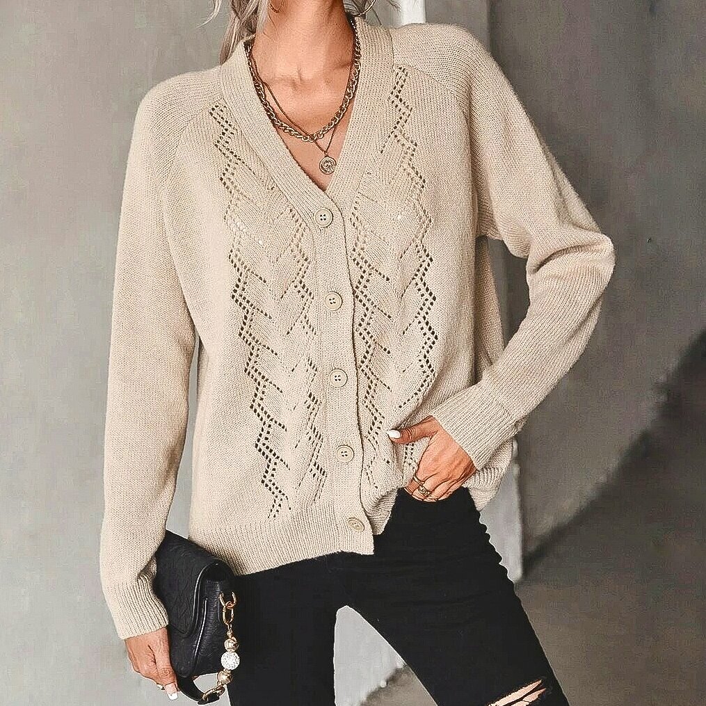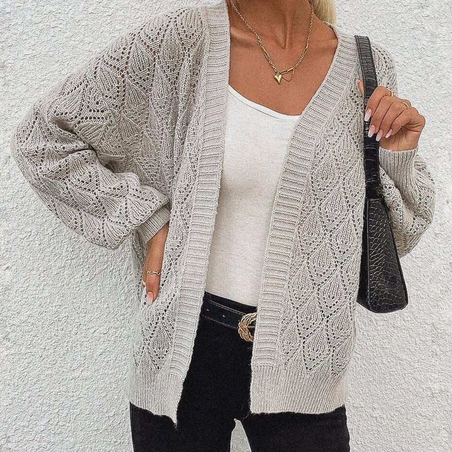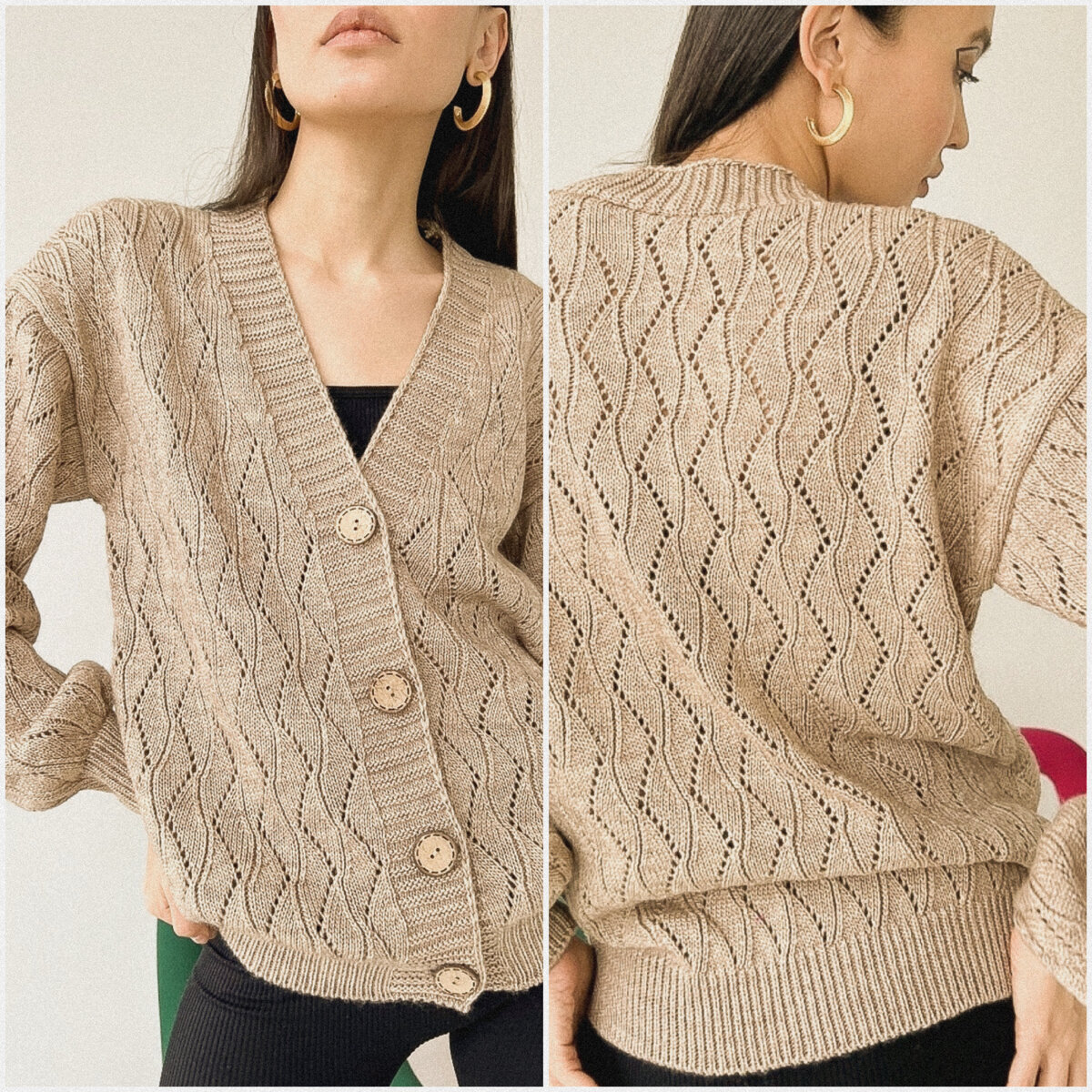 Следующая вещь — кардиган в красивом серо-бежевом оттенке из магазина Шейн, — мой однозначный фаворит. Ажурные тяжи узора по полочками вдоль цельновязаной планки гармонично сочетаются с лицевой гладью на фоне и с рукавами реглан.