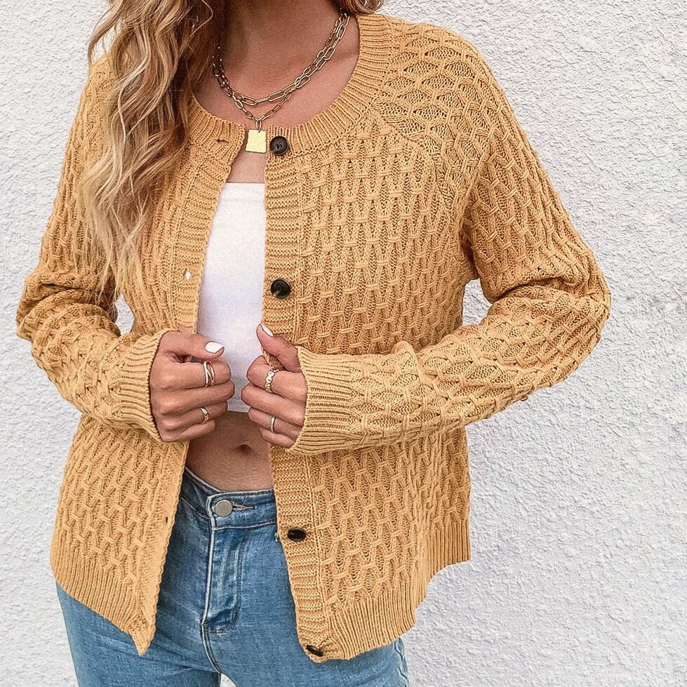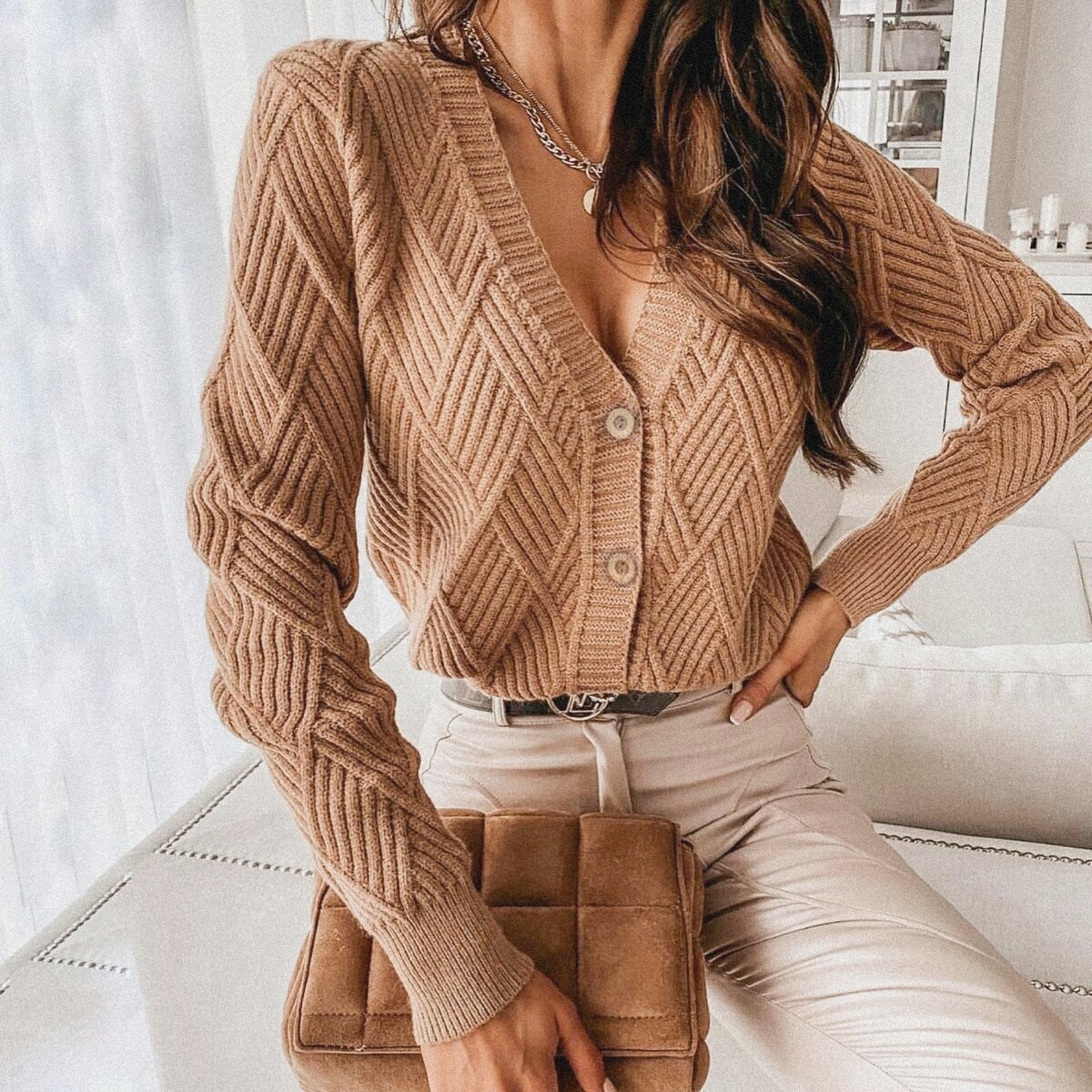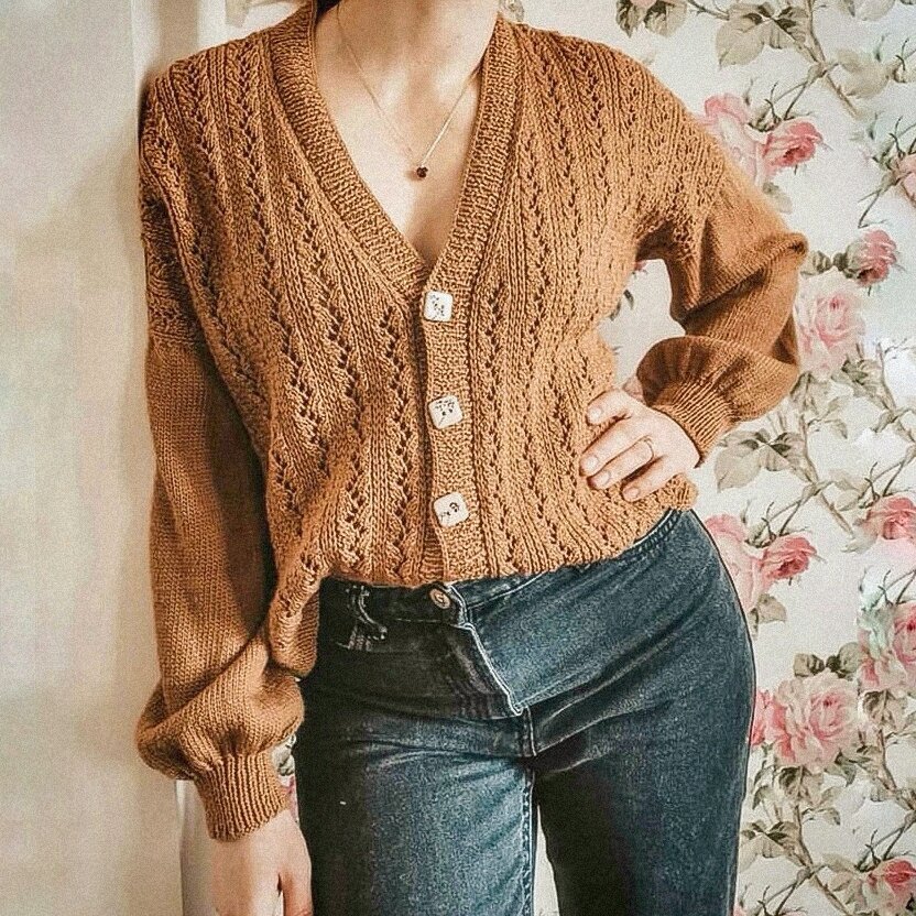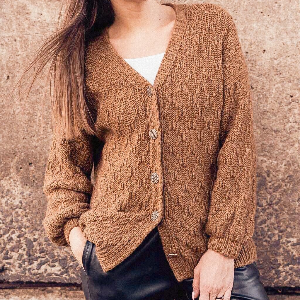 Кардиган с рельефным узором в виде ромбов в приятном осеннем оттенке. Эту модель встречала в ручном исполнении у иностранной мастерицы PetiteKnit, у неё же есть описание на английском и нескольких других языках.