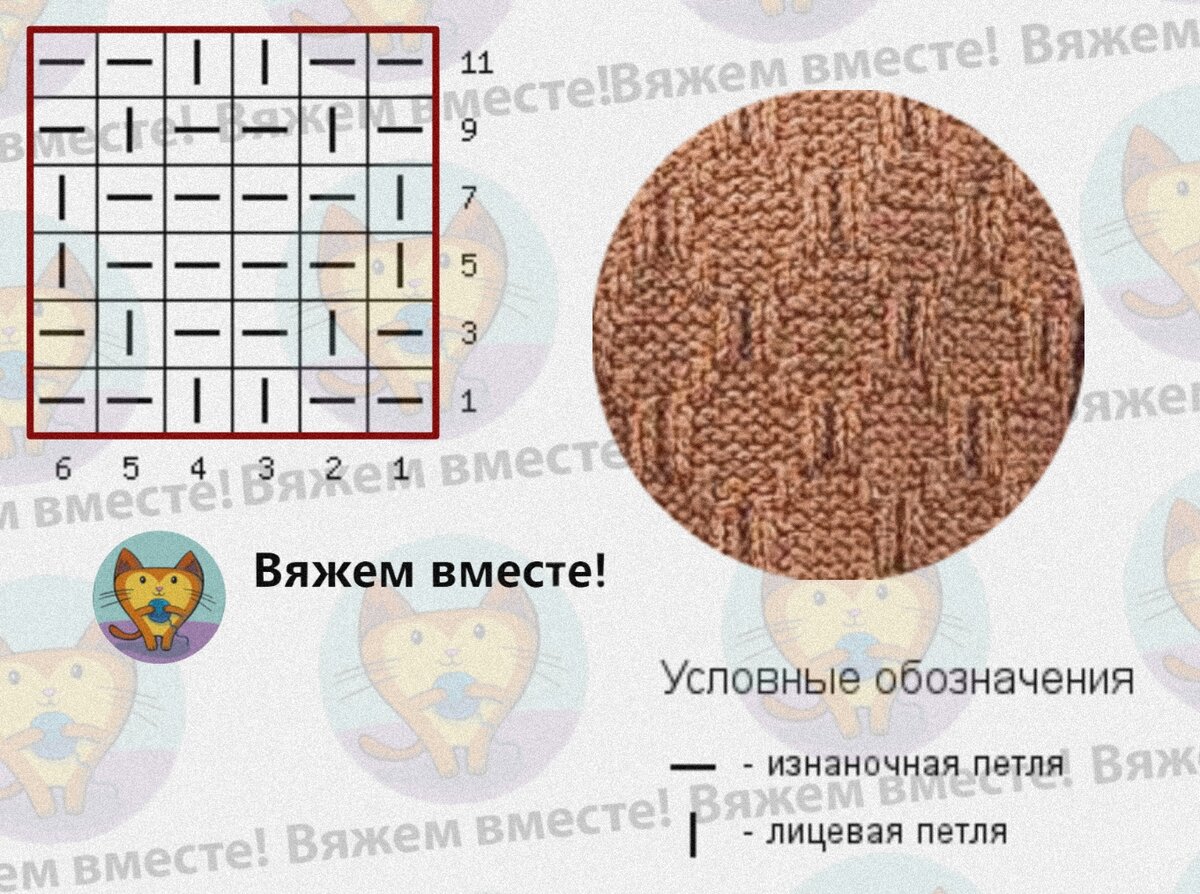 Планка вяжется цельно узором, чередующим лицевые и изнаночные ряды два через два, тем самым имитируя классическую резинку.