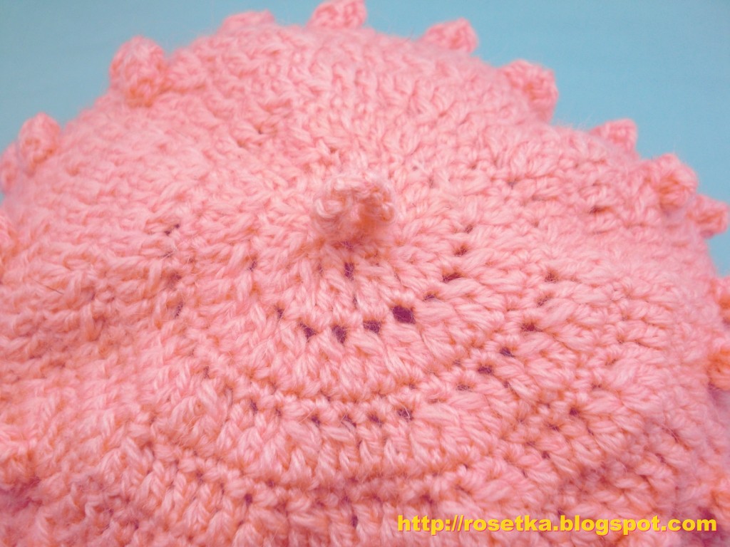 Дальше восемь рядов без «шишечек», просто чередуются ряды столбиков с накидами и столбиков без накида. Убавления также делаются по схеме.