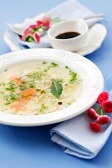 Картофель, морковь и кабачки очистить, промыть, мелко нарезать и сварить по отдельности в небольшом количестве воды. Готовые овощи протереть через сито, туда же протереть зеленый консервированный горошек, добавить овощной отвар, горячее молоко, муку, разведенную в небольшом количестве овощного отвара, приправить солью и сахаром. Все это перемешать и довести до кипения.Готовый суп заправить сливочным маслом или взбитым со сливками яйцом.