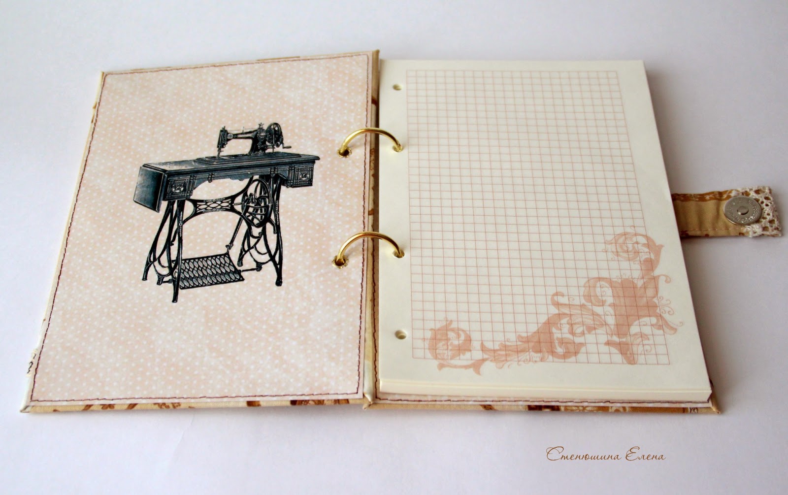 Блок для блокнота, как и в предыдущих случаях, использовала готовый. На переднем форзаце изображение старой швейной машинки с ножным приводом. Помню, в детстве, у бабушки была такая.