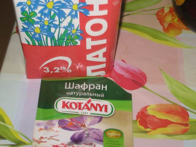 Выливаем молоко в форму для запекания, примерно треть формы, высыпаем туда шафран.