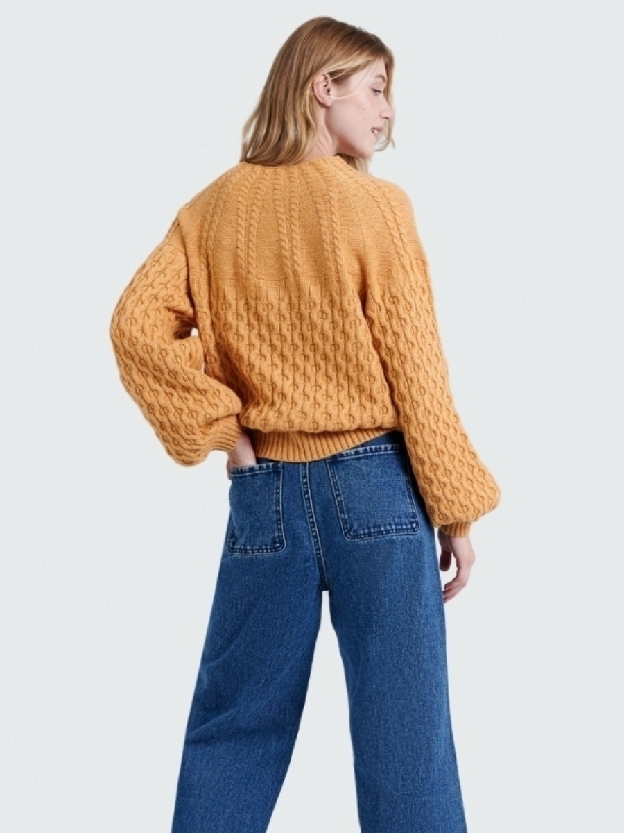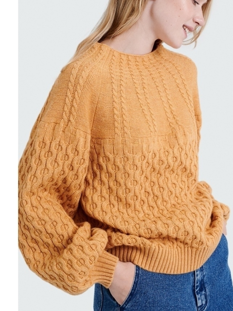 Желтый свитер принадлежит бренду Akhmadullina Dreams. Это российская марка модной женской одежды. В модели сочетаются актуальные узоры, визуально отделена кокетка. Связан свитер регланом снизу, но создается ощущение круглой кокетки. На кокетке очень интересно расположены косы, они то приближаются, то удаляются друг от друга.