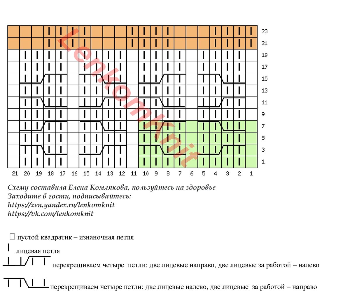 Это - схема нижней части свитера. Зеленым отмечен раппорт- десять петель, восемь рядов.