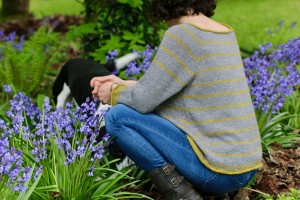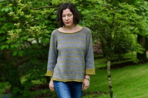 Этот пуловер вяжется спицами по кругу сверху вниз полосатым узором до подмышек, затем рукава отделяются и вяжется тело с формированием А- образного силуэта.