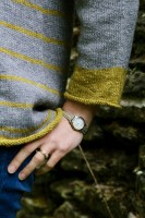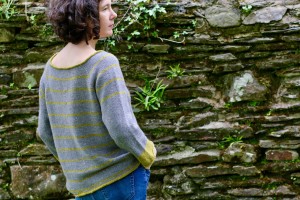 Этот пуловер вяжется по кругу сверху вниз полосами серого цвета и цвета лайм.
