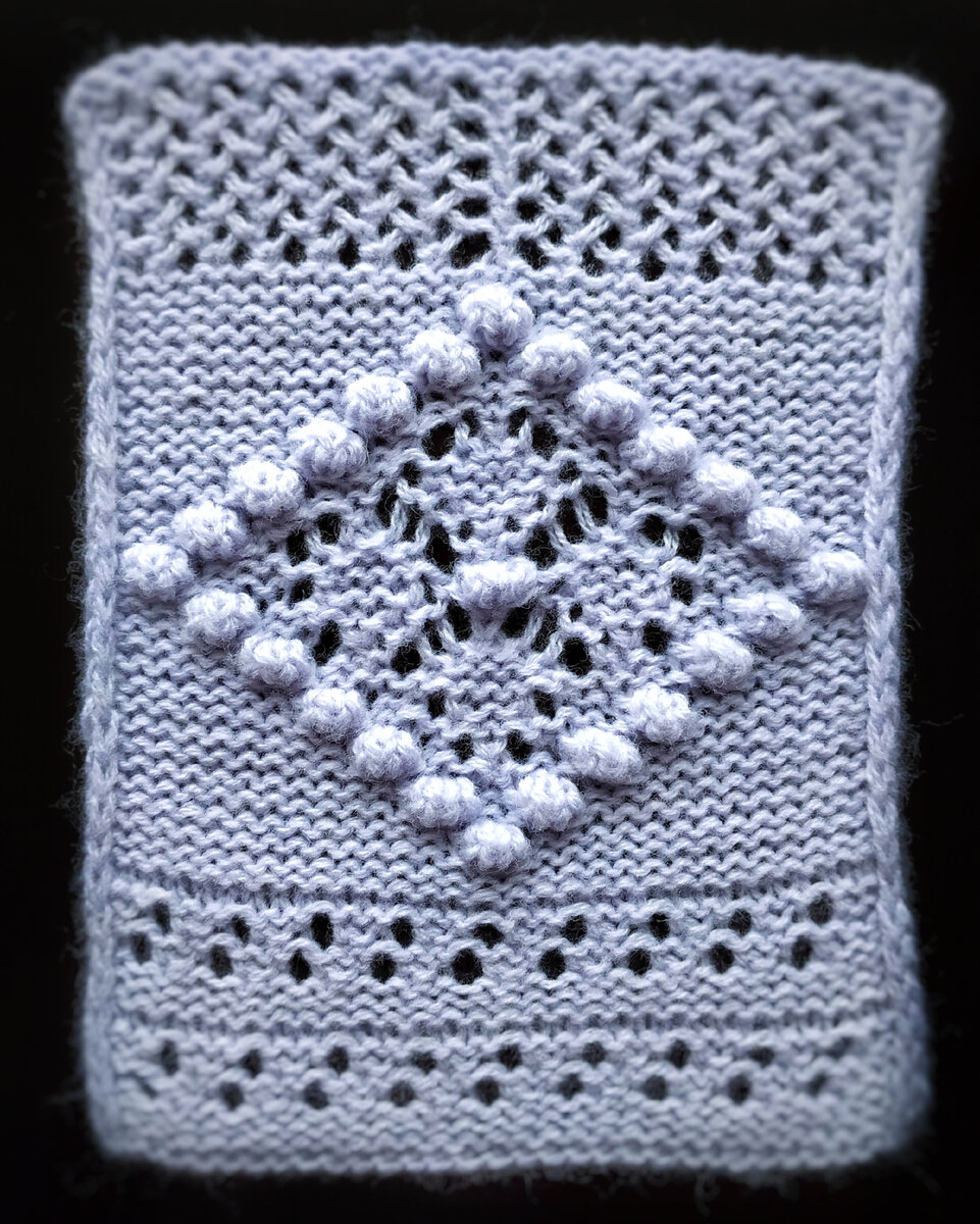 С другими узорами джемпера было попроще. Это узор-сетка, обрамляющая ромбы с шишечками и совсем несложный узор с дырочками на рукавах. В них также за лицевую сторону принята изнанка узора.