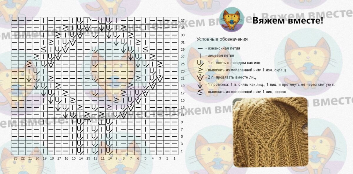 Узор переда формируется из дорожек патентной резинки (1 лиц., 1 изн., 1 лиц.). Изнаночные петли, которые необходимо провязать патентным узором, обозначены на схеме с расшифровкой 1 п. снять с накидом как изн.