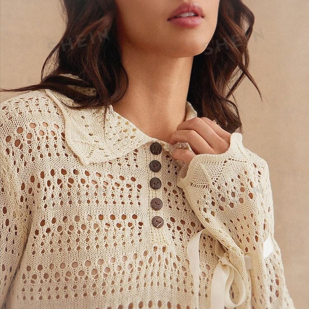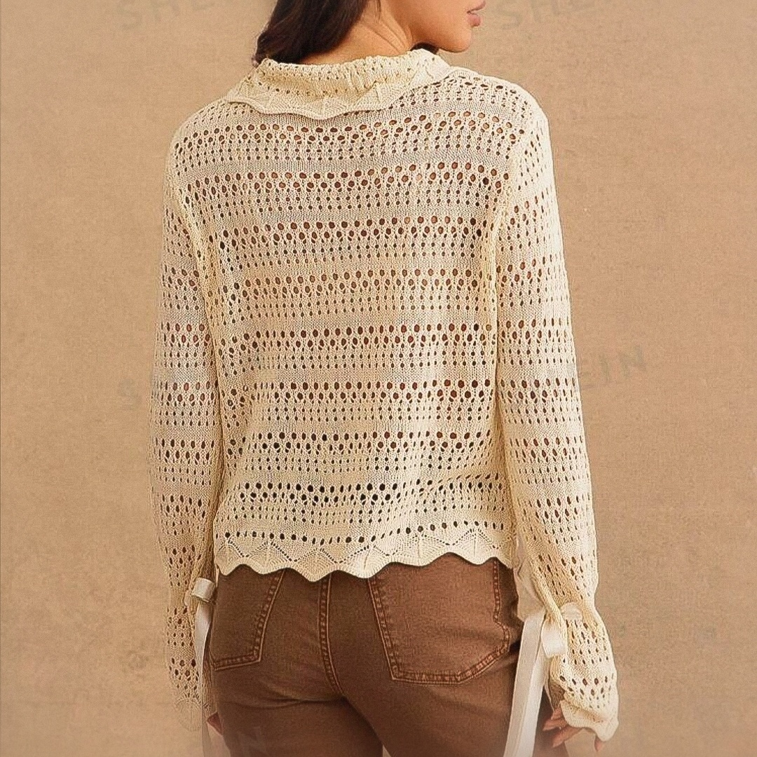 Модель сочетает лёгкость ажура с продуманными деталями, делая её универсальной для весенне-летнего сезона. Основной узор представляет собой чередование плотных и ажурных горизонталей, создаваемых накидами и убавлениями.