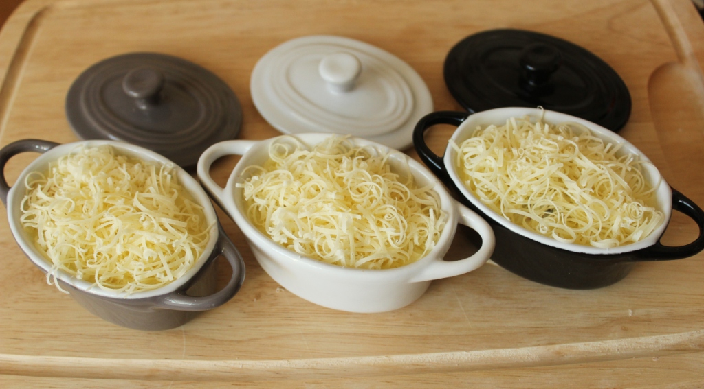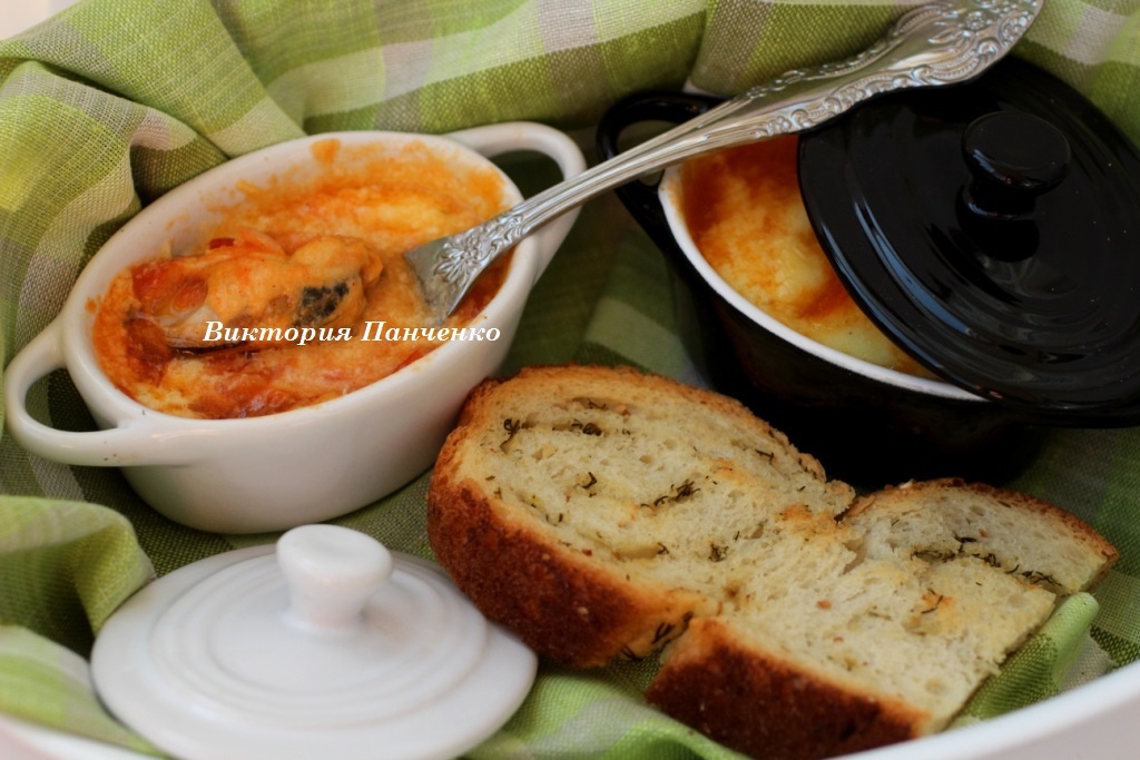 Разложить мидии с томатным соусом по жаропрочным формочкам.