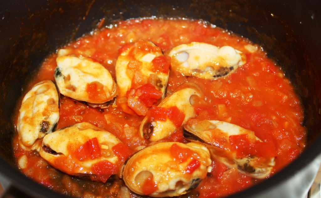 Выложить мидии в томатный соус.