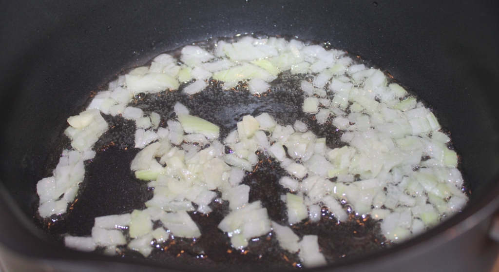 Лук и чеснок и обжарить в разогретом масле 1 мин.