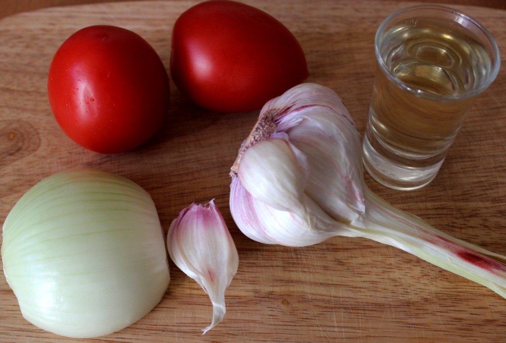 Подготовить ингредиенты для томатного соуса. Мелко порубить лук и чеснок.