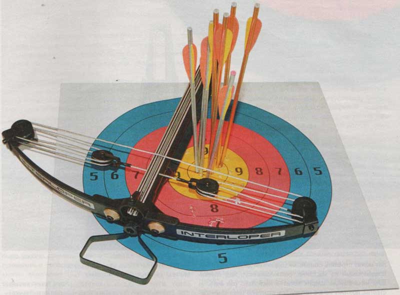 Удивительна мощь арбалета, - прочный, предназначенный для соревнований щит он пробивает насквозь, так что стрелы высовываются с другой стороны, и вытаскивать их приходится вдвоем. Впрочем, это имело место на небольшом расстоянии, при стрельбе на 50 или 65 метров вытаскивать стрелы будет легче.