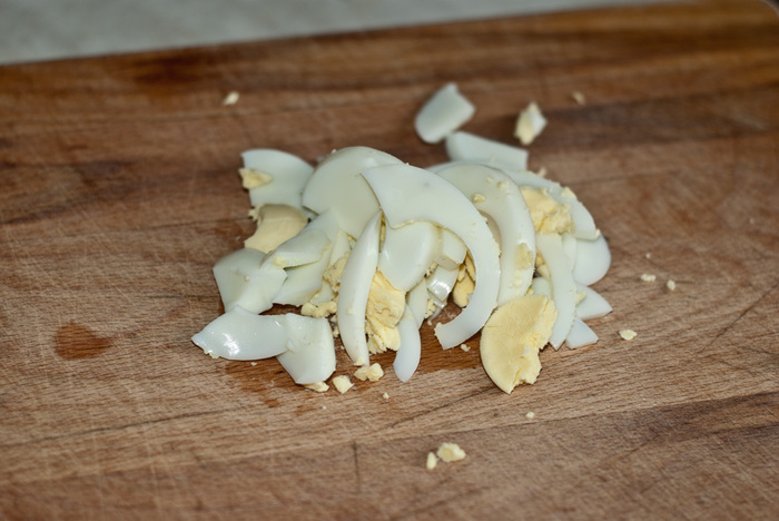Яйца режем пополам, и получившиеся половинки режем пластинками, толщиной миллиметра по два. Оставляем ждать пока баклажаны остынут.