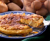 Картофель отварить, но не до конца так, чтобы он был твердоватым, затем нарезать лук и посыпать им картофель. Все посолить по вкусу, залить приготовленной омлетной массой и выпекать в духовом шкафу. Перед подачей на стол посыпать зеленью.