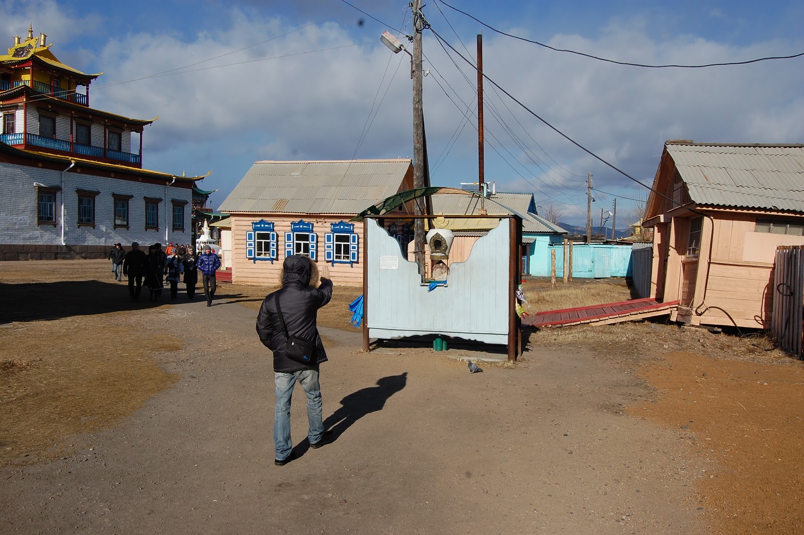 Перед воротами Дацана полно машин и автобусов, люди заходят и выходят, торговцы бойко торгуют сувенирами. Место где расположен дацан - долина между невысокими горами , продуваемая в это время пронизывающими холодными ветрами. [320x212]