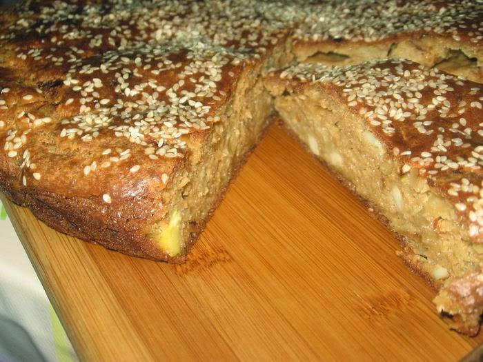 Вылить в приготовленную форму для выпечки, застеленную смазанным маслом пергаментом, или в кастрюлю мультиварки. В мультиварке пирог получится повыше, так как площать там поменьше, чем у моей формы. Сверху я посыпала кунжутом. Просто так.