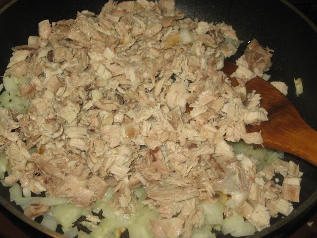 Обжарить репчатый лук, добавить нарезанное мясо, посолить, поперчить.
