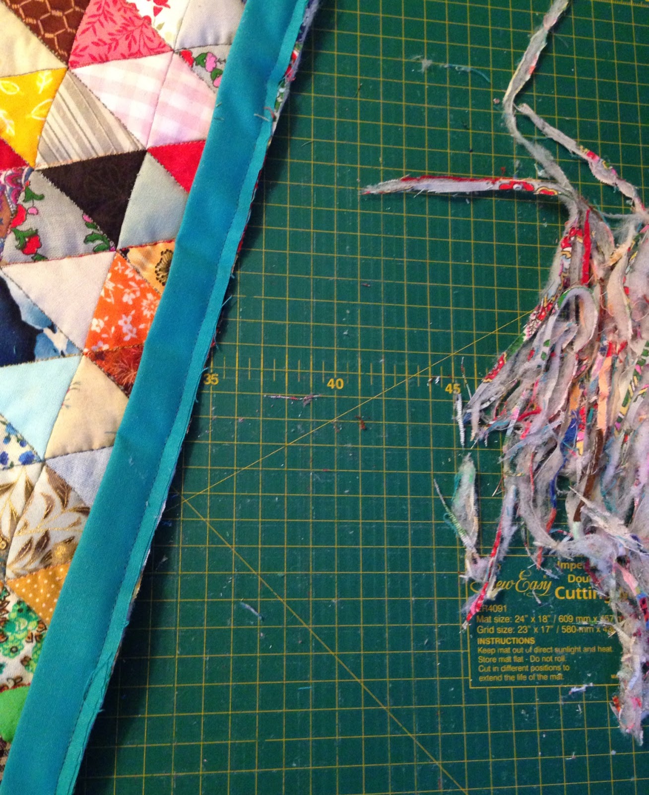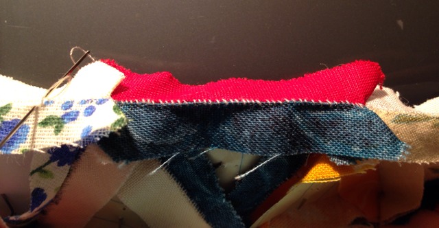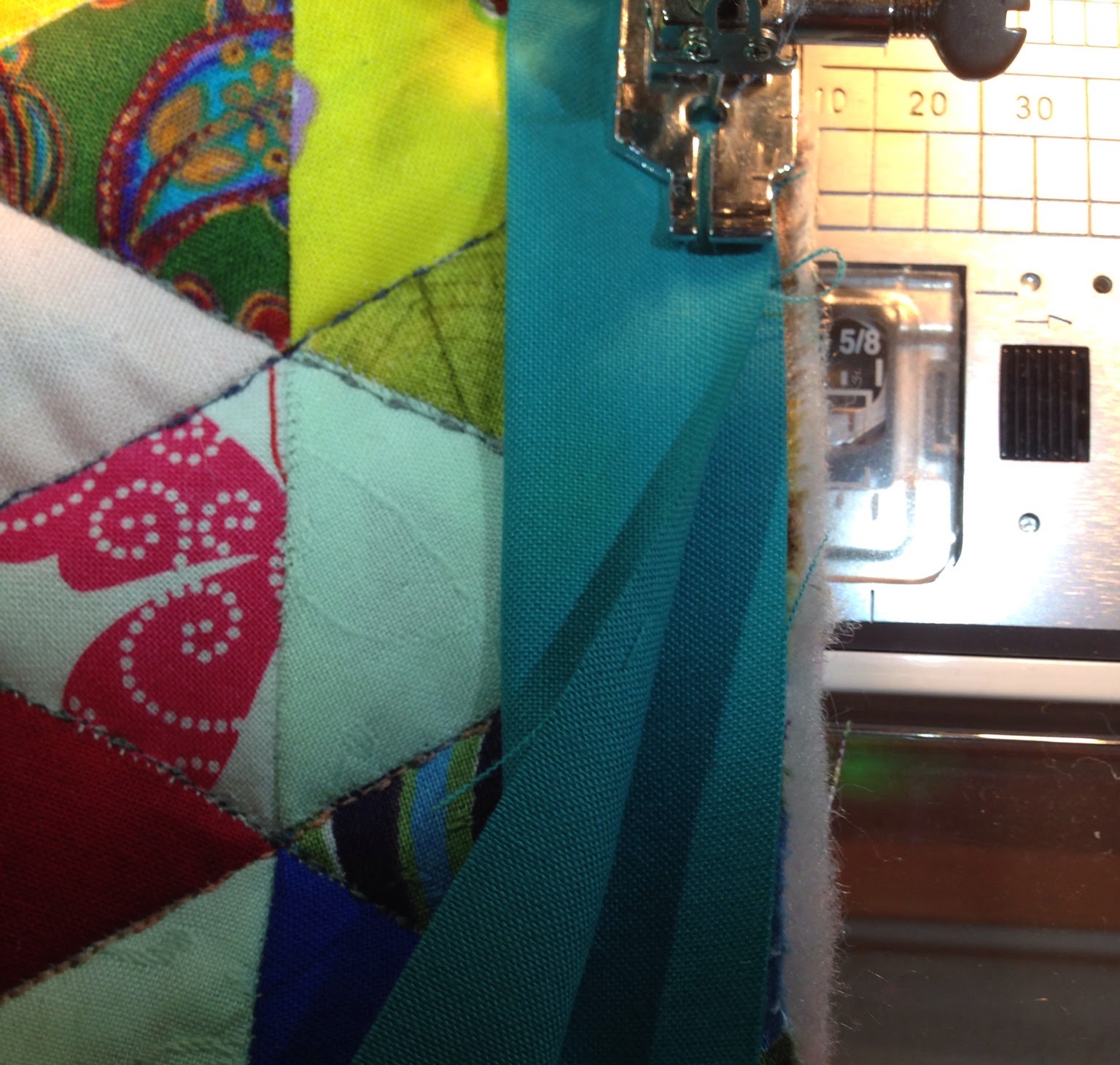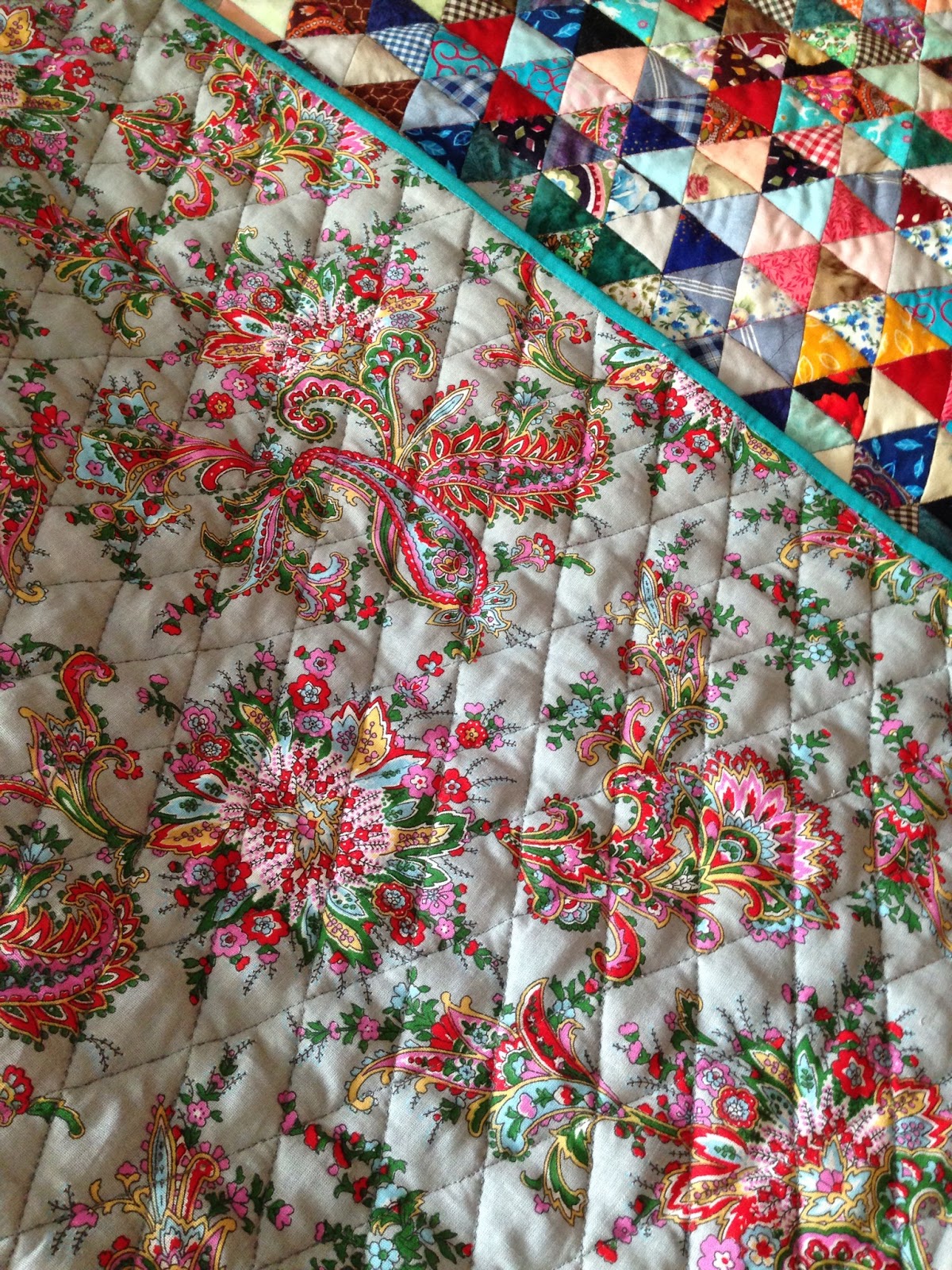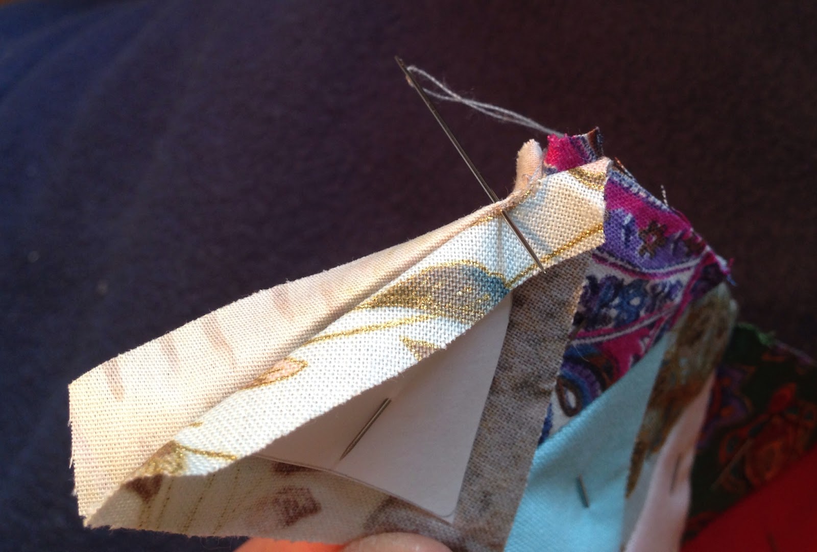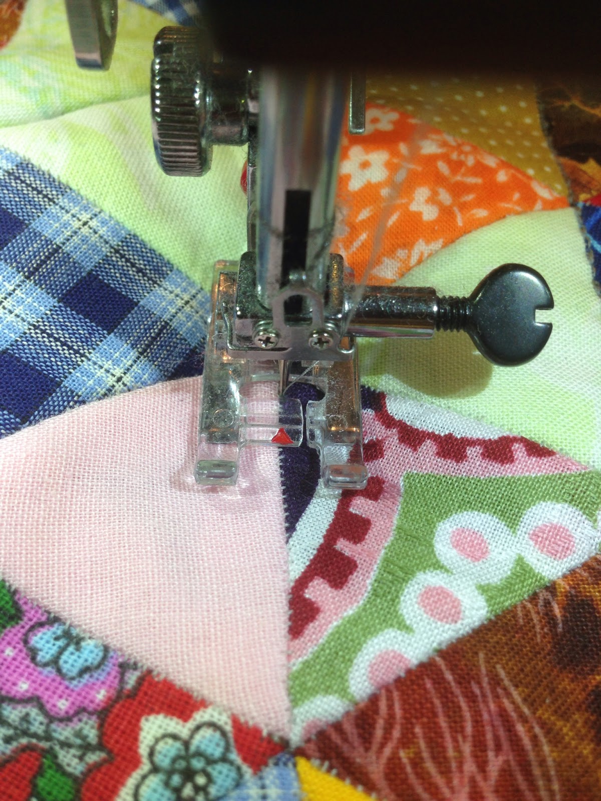2) При стёжке надо довольно сильно растягивать ткань в стороны. Иначе набегает "волна". Волна из ткани набегает и при любой стёжке, вина тому - прижим лапки и многослойность изделия. Но в данном случае лоскутные треугольники, выкроенные так и сяк и никогда в одном направлении, лишь усугубляют положение. Пузырятся и волнятся. Так что - растягивать, не ленясь. Главное при этом - избежать заломов, а пышность, волнение ткани и естественная для неё неровность (ткань же - не кафельная плитка!) останутся в любом случае.