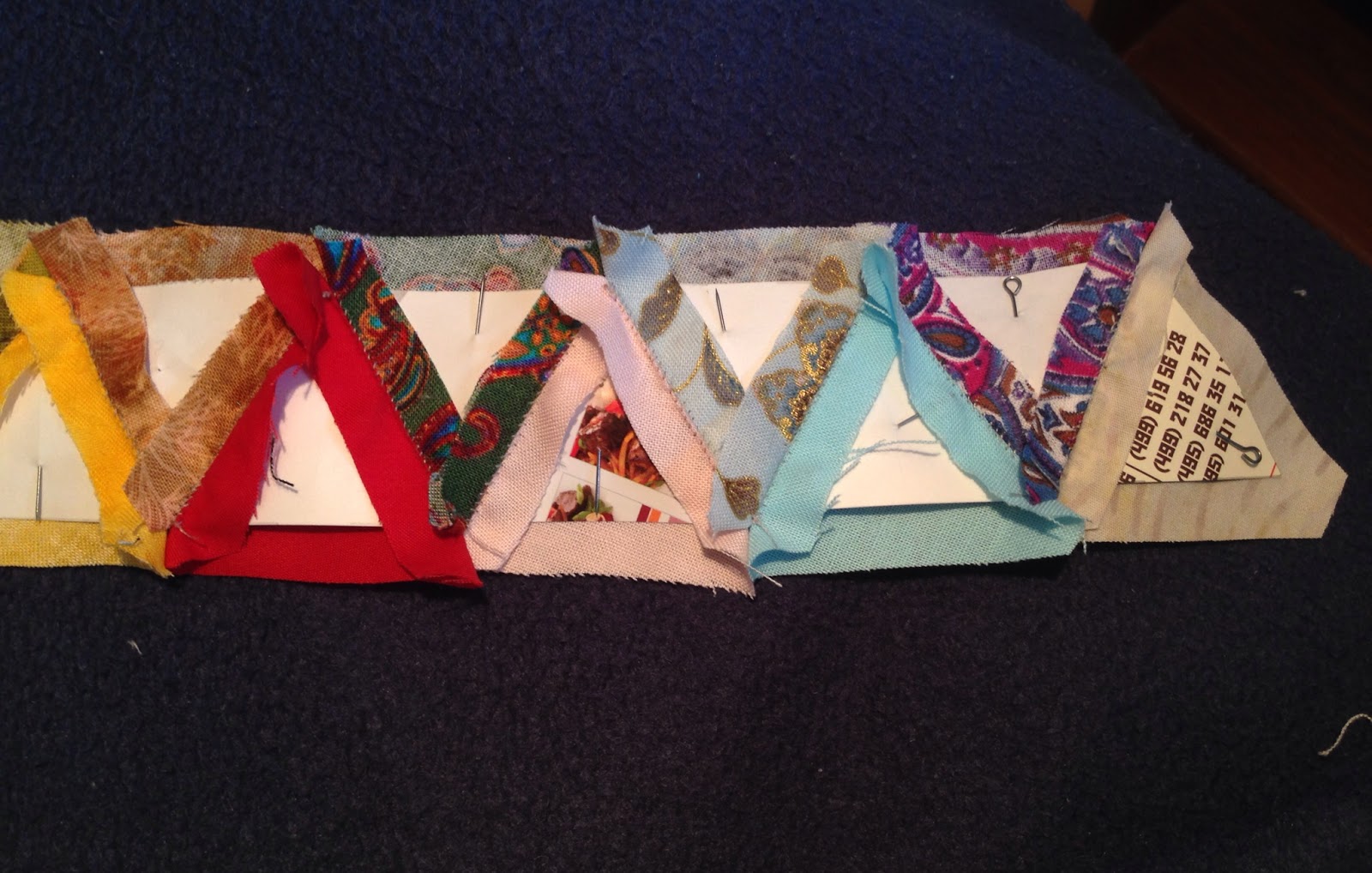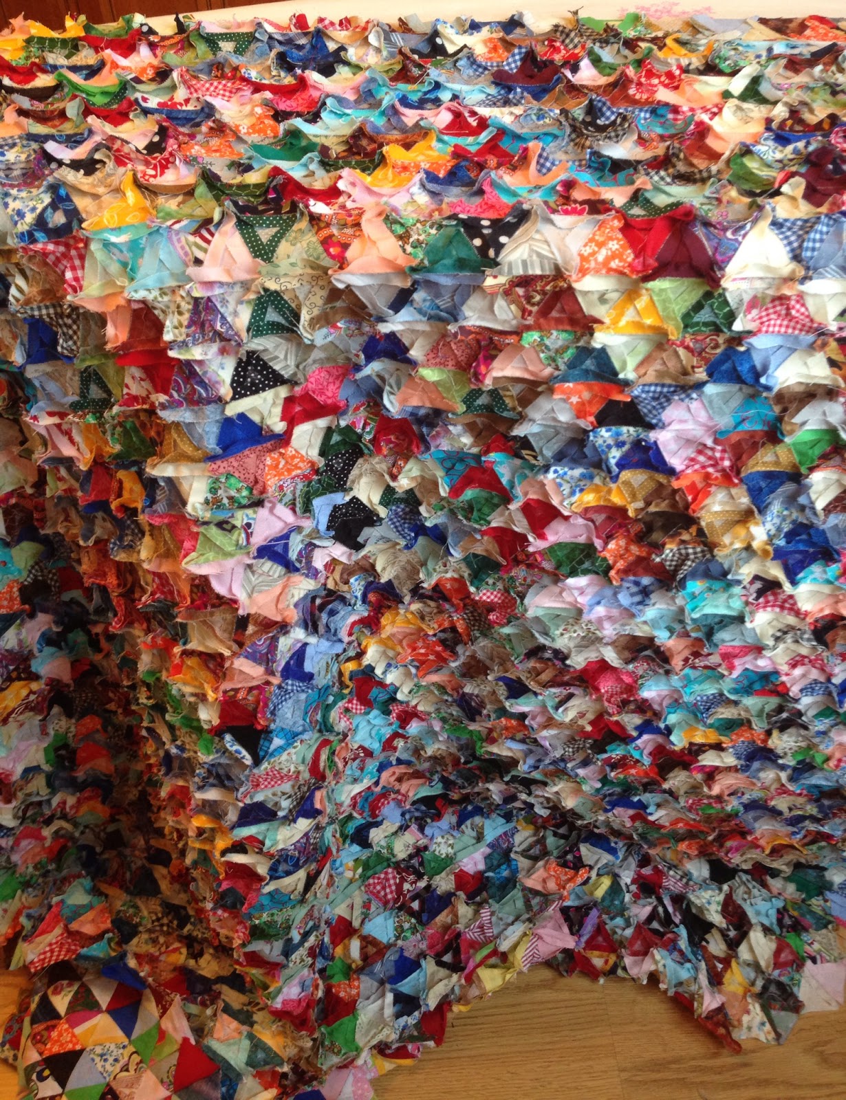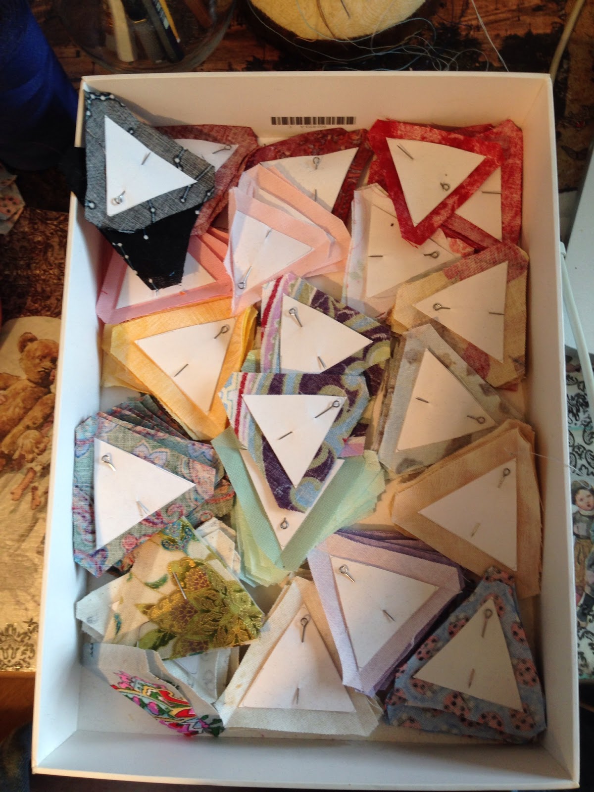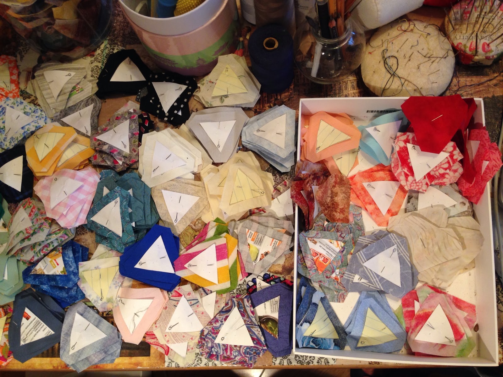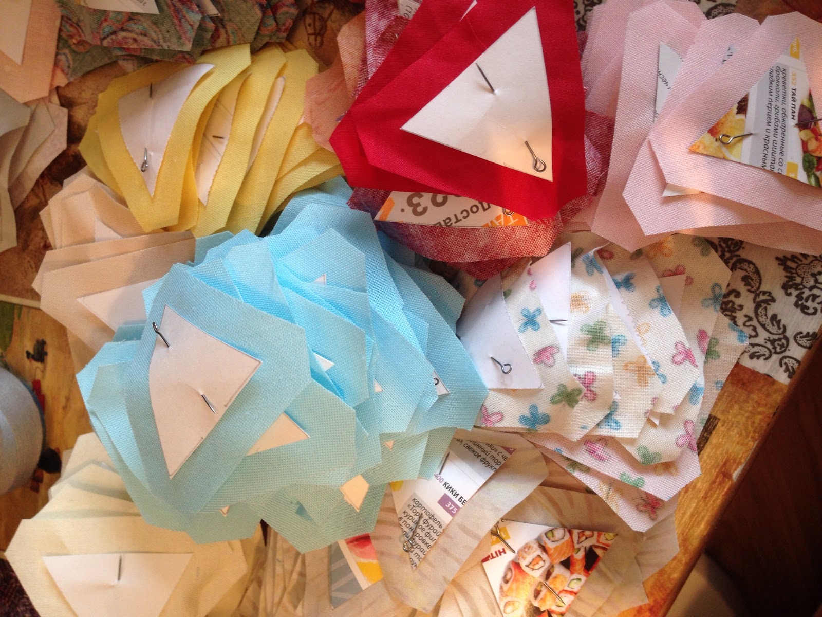 Количество тканей - 84 (из некоторых лоскутов удалось выкроить лишь по 2 треугольника, а из некоторых - по 20 и даже 40).