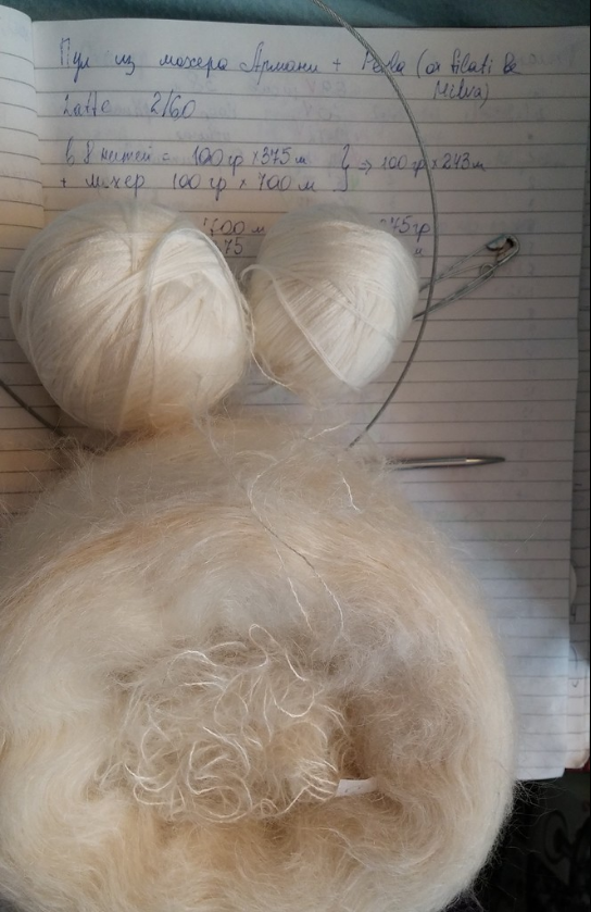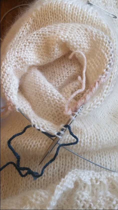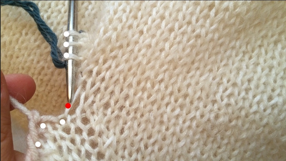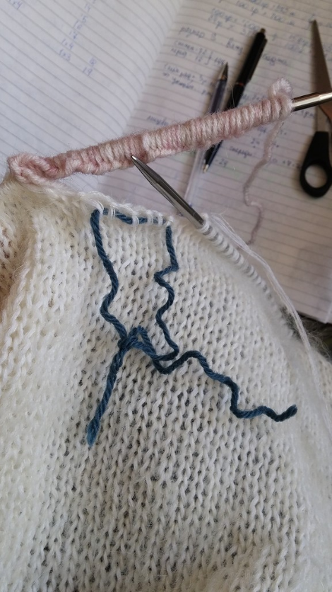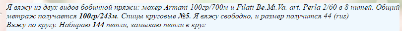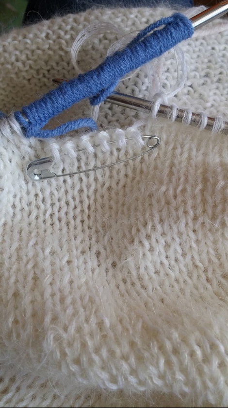 А еще я вяжу без маркеров. Но чтобы не запутаться, для рукавов использую ниточки разного цвета. В данном случае светлая - левый рукав, синяя - правый.