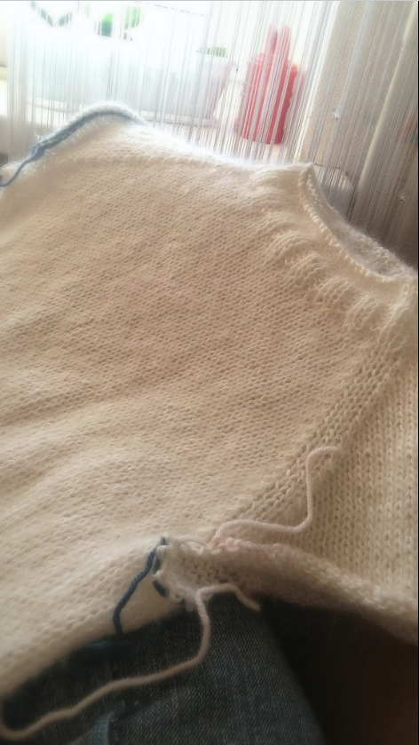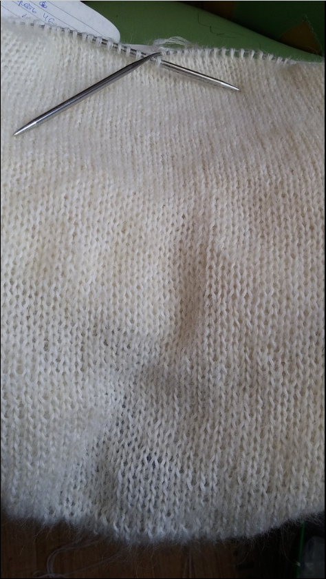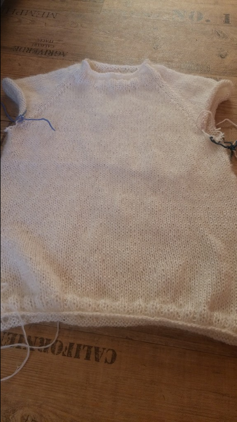 Сделав начальный регланный ряд, (отложив петли и набрав над ними петли рукава), провязываю еще один ряд на всех петлях. И теперь можно приступать к убавкам.