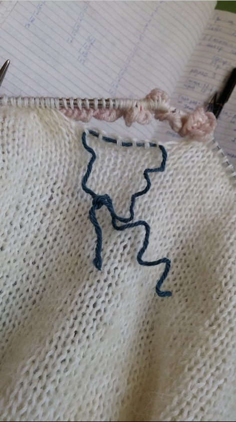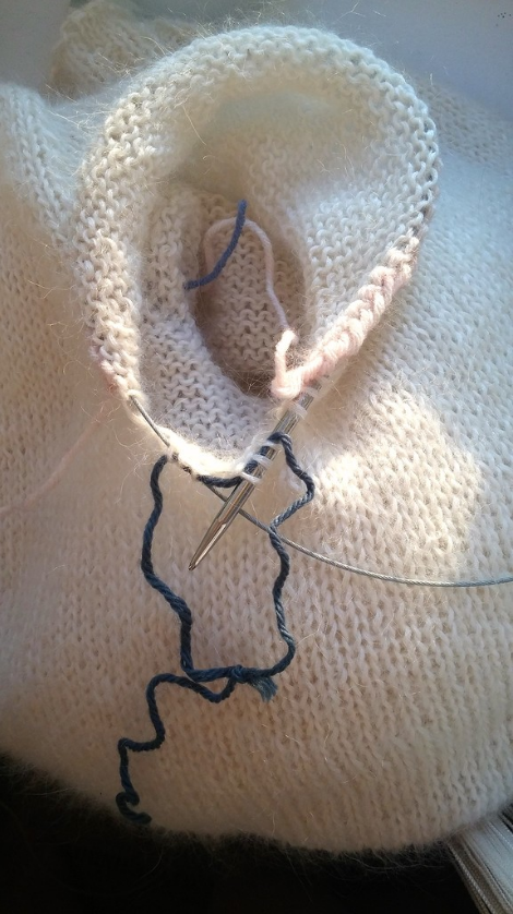 Итак, размечаем по бокам 6 петель. (тут не забыть учесть, что снизу перепад длины). Эти 6 петель я снимаю на булавку, или доп.нить. А над ними набираю контрастной нитью 46 петель рукава и провязываю их. Продолжается вязание по кругу и никаких разрывов нити.