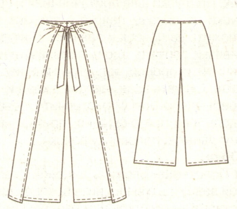 Такой способ предполагает обработку края деталей по бокам и выполнение лишь среднего шва брюк. Ткань более-менее свободно расходится в месте запаха на бедрах, поэтому строгих примерок не понадобится. Фиксация брюк на талии осуществляется при помощи пояса в виде завязок.