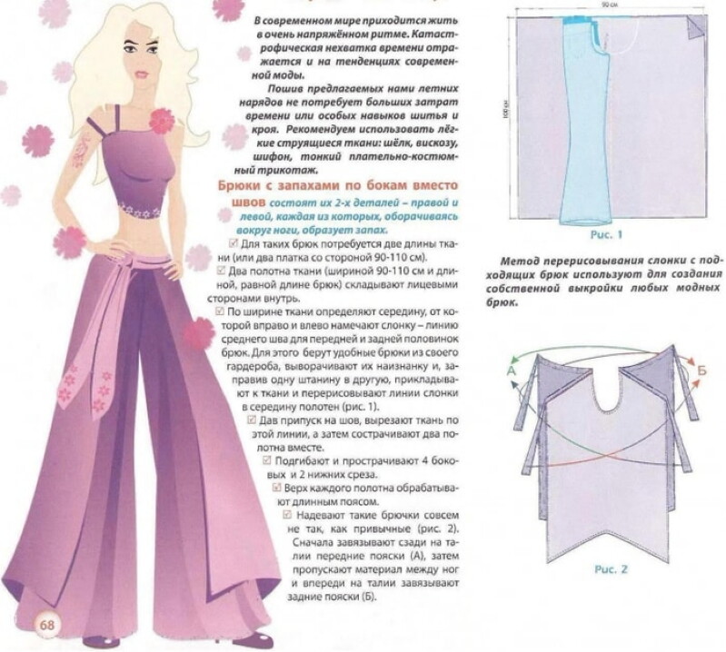 Погода уже требует новых легких вещей, и за ними не обязательно отправляться по магазинам. Сшейте легкие брюки оригинального фасона, потратив на работу меньше часа. Самое сложное в пошиве этой модели — подобрать правильную ткань. Выбирайте легкий и струящийся материал, который выгодно подчеркнет любую фигуру, визуально сделав ноги длиннее. Такая модель отлично смотрится исполненной и из легких натуральных тканей, и из шелка для вечернего выхода.