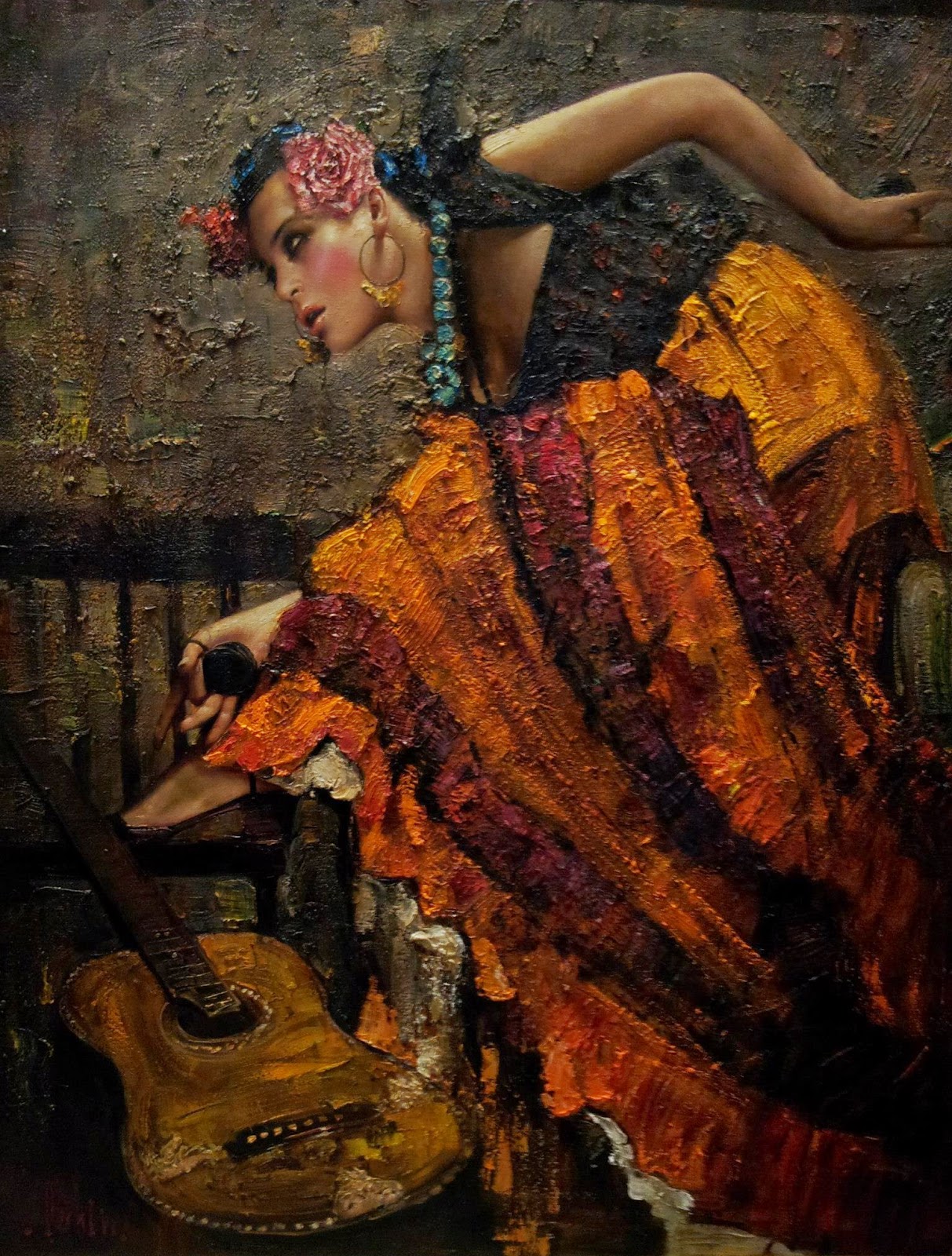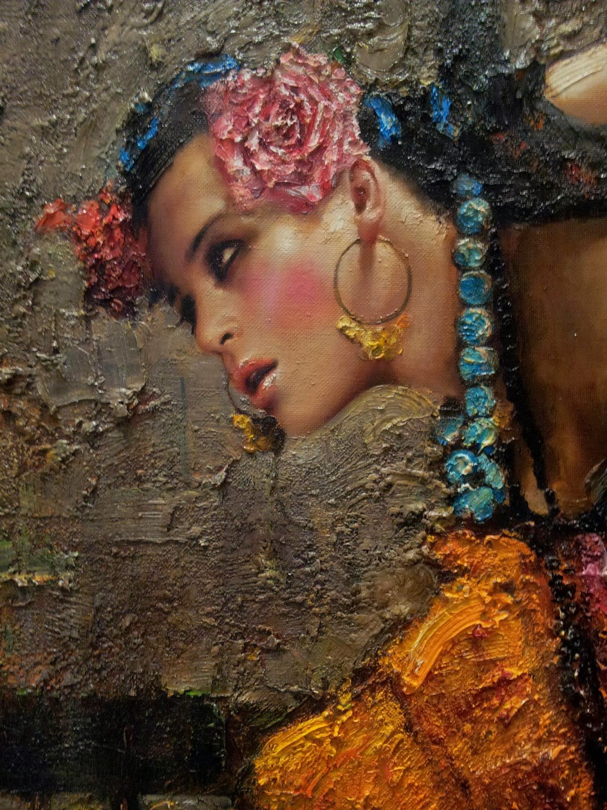 Изящные девушки и дамы на картинах Мухина воспевают гимн женственности, любви и красоте. Кроме ярких красок и подчёркнутого романтизма, работы художника отличает нарочитая театральность и оригинальная техника.