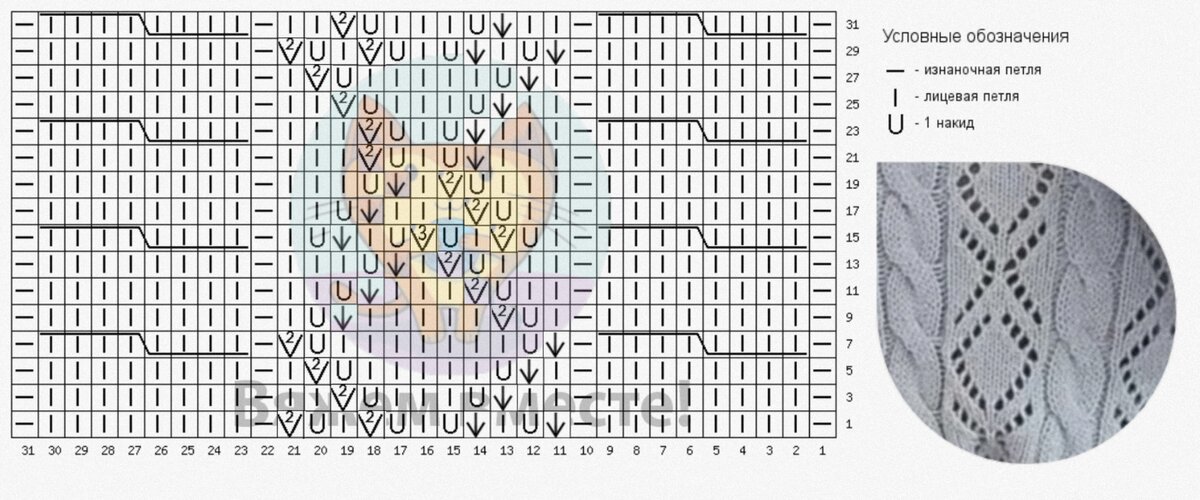 Примечательный в данной модели лишь узор, который чередует в себе дорожки с ажурными ромбами и вертикальные жгуты на фоне изнаночной глади. Узор очень простой, но как эффектно смотрится в готовом полотне! На схеме указаны только лицевые ряды, изнаночные вязать как лежат, петли, накиды — изнаночными.