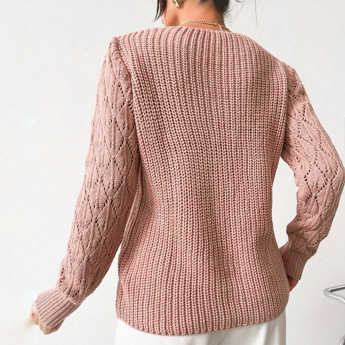 Джемпер с ажурной треугольной кокеткой и ажурными рукавами, выполненными простым женственным узором в виде листиков.