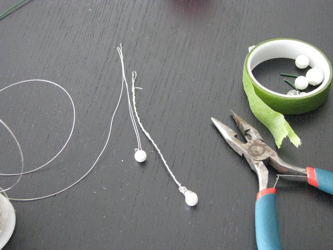 4. Сделаем декор с бусинами: бусину оденем на проволоку, возле бусины накрутим несколько колец, чтобы получилось плавный переход от толстой бусины к длинной части. Таких надо 3-4 длинных и 2 коротких с большими бусинами. Сделаем несколько окружностей из проволоки разного размера.