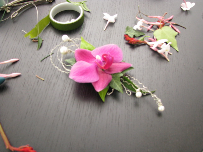 [показать]8. Ставим орхидею в пробирку (я просто приклеила, срез замазала клеем), добавим бутоны снизу и сверху, с боков тоже! Лепестки орхидеи приклеим к листикам плюща, чтобы не обвисли на жаре.