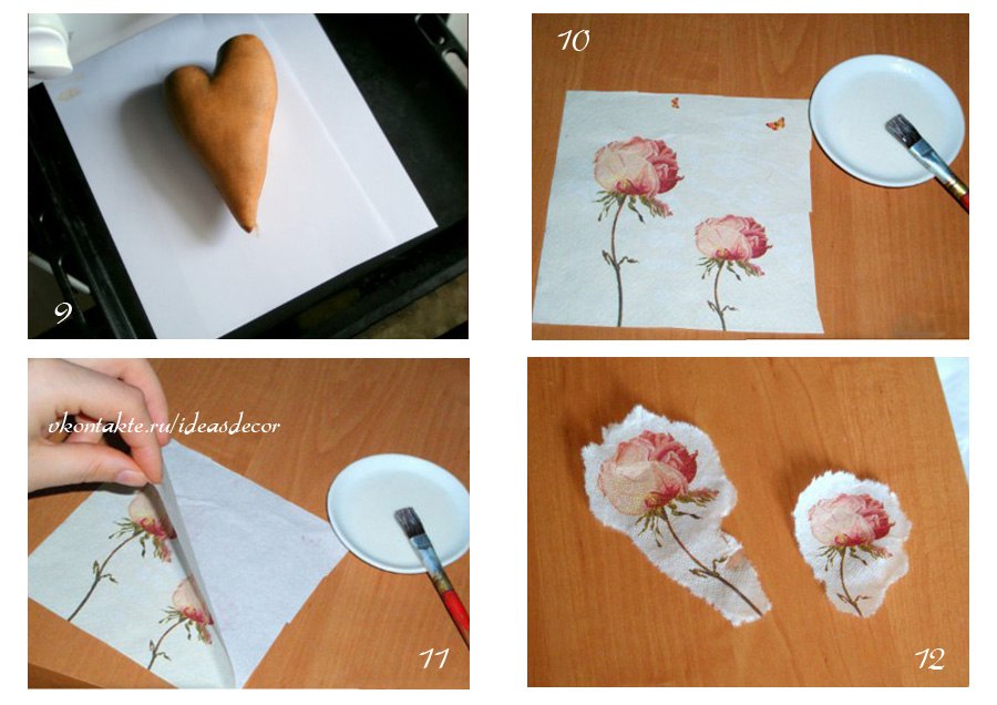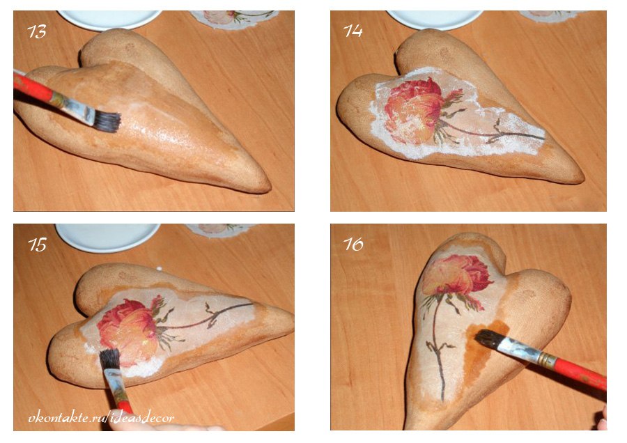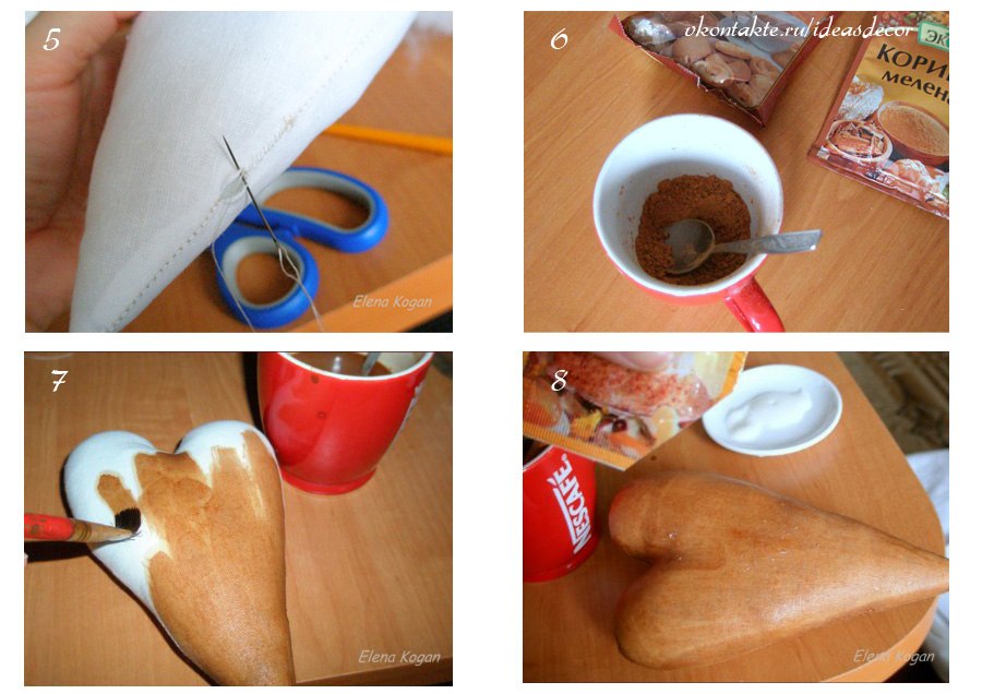 Для покраски я использую жесткую кисть (рис. 8), красим сердечко с двух сторон, следя, чтобы швы тоже хорошо прокрасились. Затем посыпаем сверху ванилью (рис. 9) и растираем рукой. Теперь игрушку можно сушить.