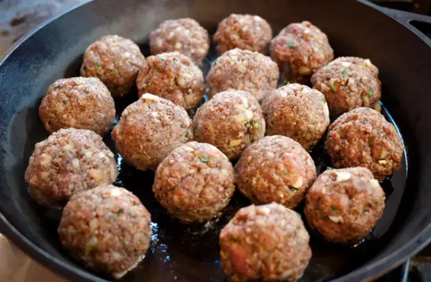 Разогреть духовку до 90 градусов. В широкую сковороду на высоту примерно 1 см налить масло для жарки и нагреть его до 180 градусов. Работая партиями, обжарить фрикадельки ос всех сторон, поворачивая их, около 2 минут. Готовые фрикадельки выложить на противень и убрать в духовку.