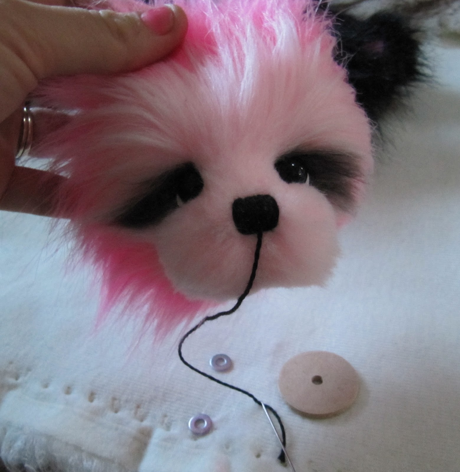Вставьте ваши глаза, как вы это обычно делаете. Я делаю это, делая крошечный разрез в меха в центре глазницы (просто убедитесь, что Вы не отрезать нитки Вы использовали, чтобы утопить розетки в первую очередь. Еще одна подсказка при настройке глаза на искусственный мех медведей отрезать только один поток в поддержку. Искусственный мех обычно вяжут покрытием, и с натяжением помещается на нем, так плотно набили - он будет распутывать очень большие, если вы слишком сильно урезали).