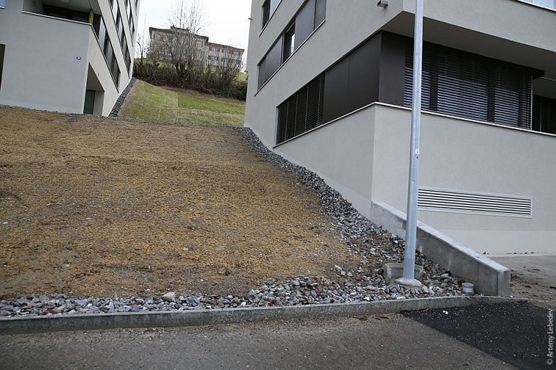 Швейцария. Большой объем наклонного говна. Что делают умные люди? Отсыпают края щебнем.
