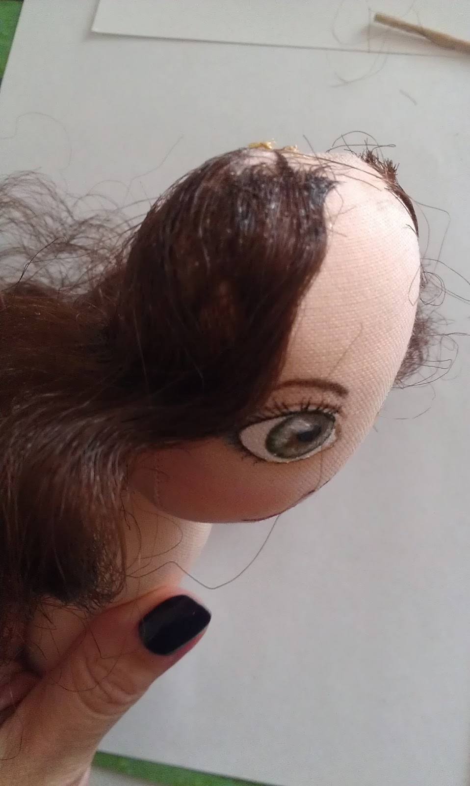 Девочки, я начинаю клеить с затылка по направлению к вискам, мне так удобнее. Обильно намазываю клеем голову куклы, т.е. то место, куда клею прядь, прикладываю прядь, распределяю равномерно, чтобы все волосы проклеить и фиксирую. Важно знать - если несколько раз прижимать палочкой волосы, отпускать, опять прижимать, то клей, оставшийся на палочке, будет прилипать к волосам, образуя белые катышки, а это нам совсем не нужно).